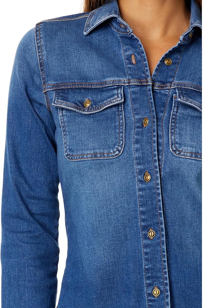 Featuring a classic silhouette, the KUT from the Kloth Romy Shirt Pocket Flap Jacket adds style to your look. The stretch-denim jacket has a folded collar with a button-up front closure, long sleeves with buttoned cuffs, and a curved hemline. Button-flap patch pockets make this stretch-denim shirt right on trend, while the classic silhouette is easy to wear on its own or as an outer layer. Two button-flap pockets on the front. 87% cotton, 12% polyester, 1% spandex. Hand wash. Imported.