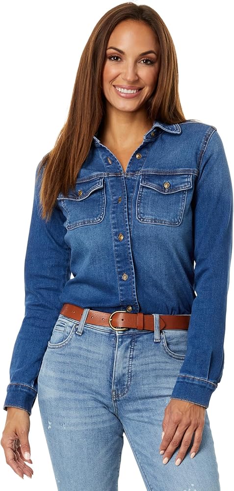 Button-flap patch pockets make this stretch-denim shirt right on trend, while the classic silhouette is easy to wear on its own or as an outer layer.