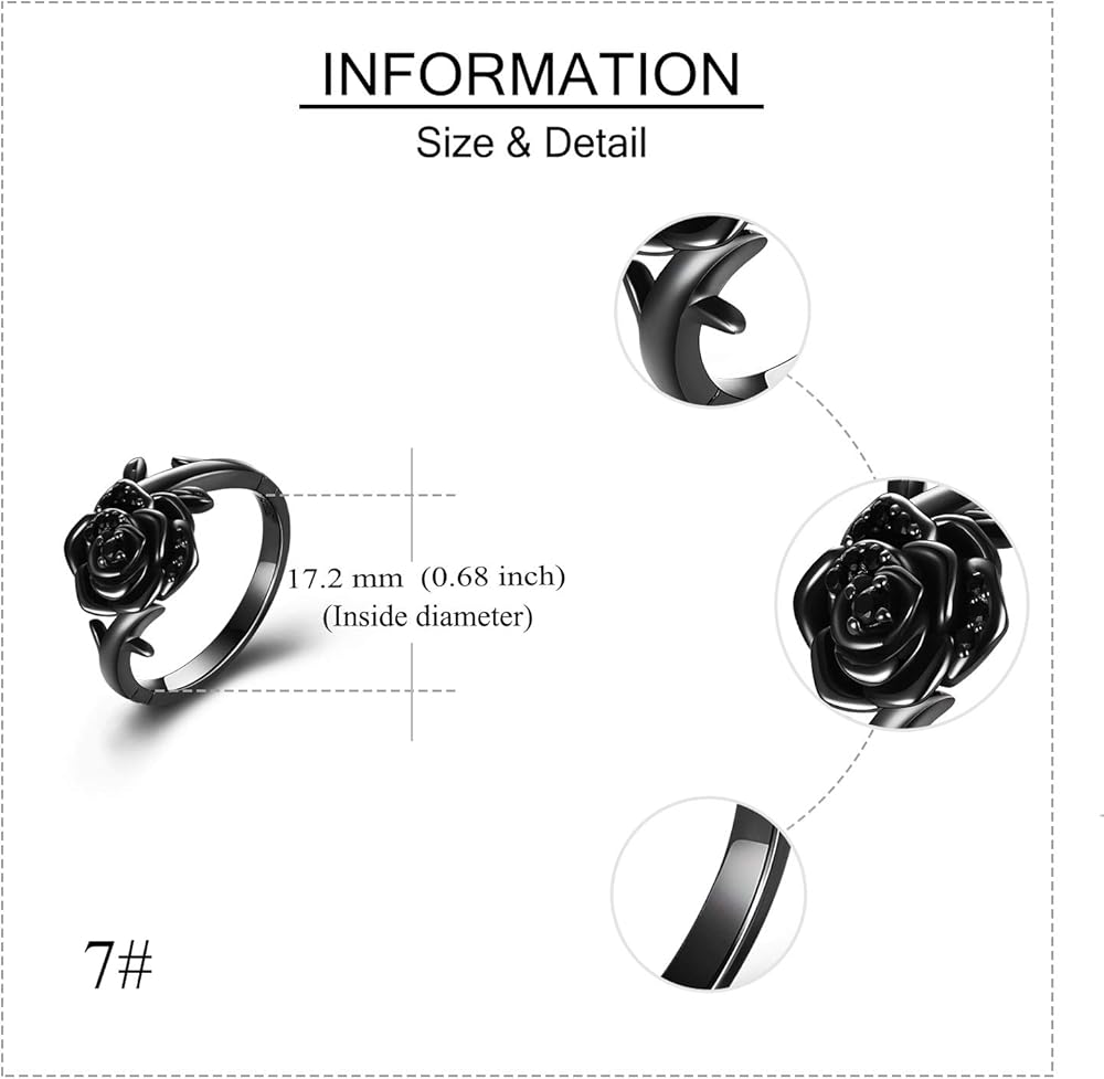 🌹حجم خاتم وعد الورد لها 🌹هذا الخاتم متوفر الآن من مقاس 7 إلى مقاس 8. المقاس الأمريكي القياسي. مقاس 7 خاتم زهرة الورد الأسود القطر الداخلي 17.2 مم (0.68 بوصة). مقاس 8 خاتم زهرة الورد الأسود القطر الداخلي هو 18 مللي متر (0.71 بوصة).