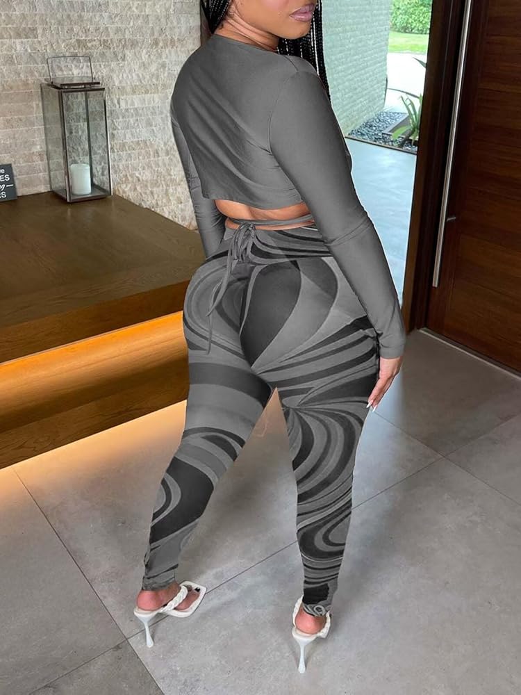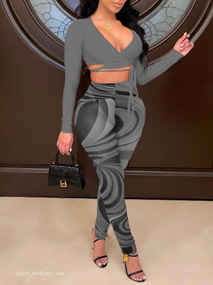 • المميزات: بذلة مثيرة مكونة من قطعتين للسيدات بأكمام طويلة، ورقبة متقاطعة، وسروال شبكي، ومقاس ضيق، وطباعة ملونة، وقميص بدون أكمام بلون ثابت.