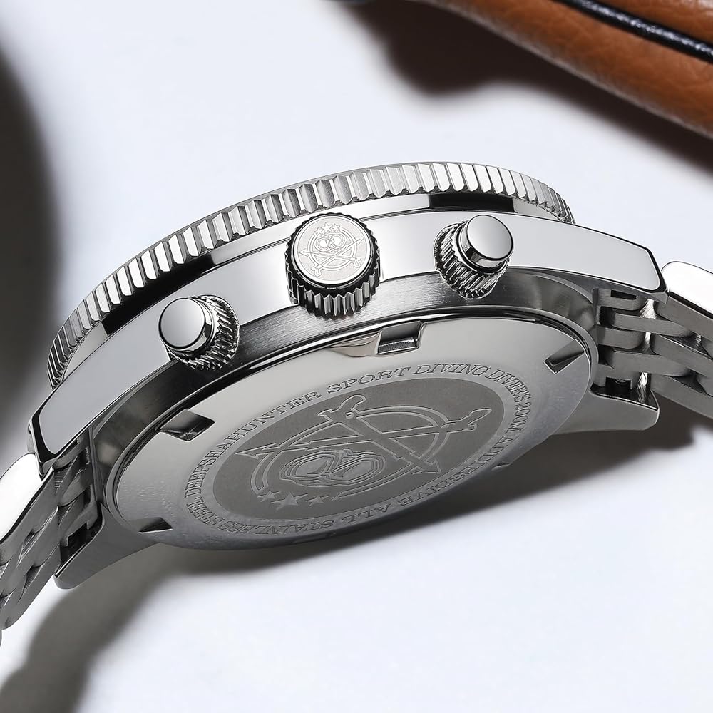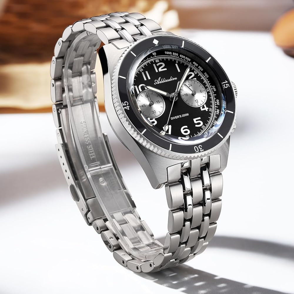 【المميزات】: حركة كوارتز يابانية VK64، سوار صلب من الفولاذ المقاوم للصدأ، ياقوت صناعي مقعر، إطار مقياس سرعة الدوران أحادي الاتجاه