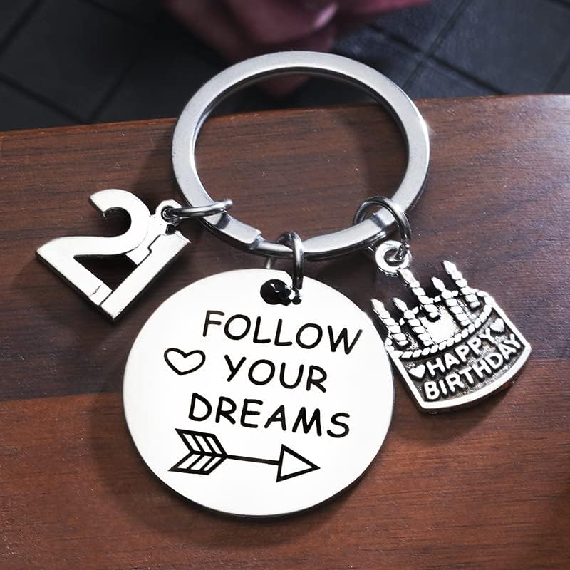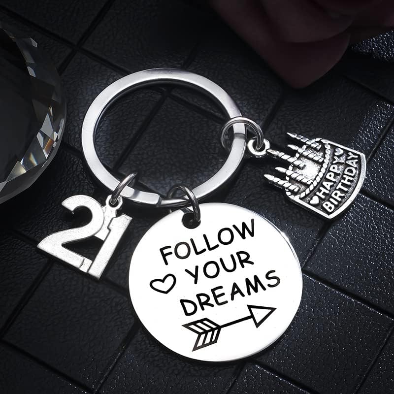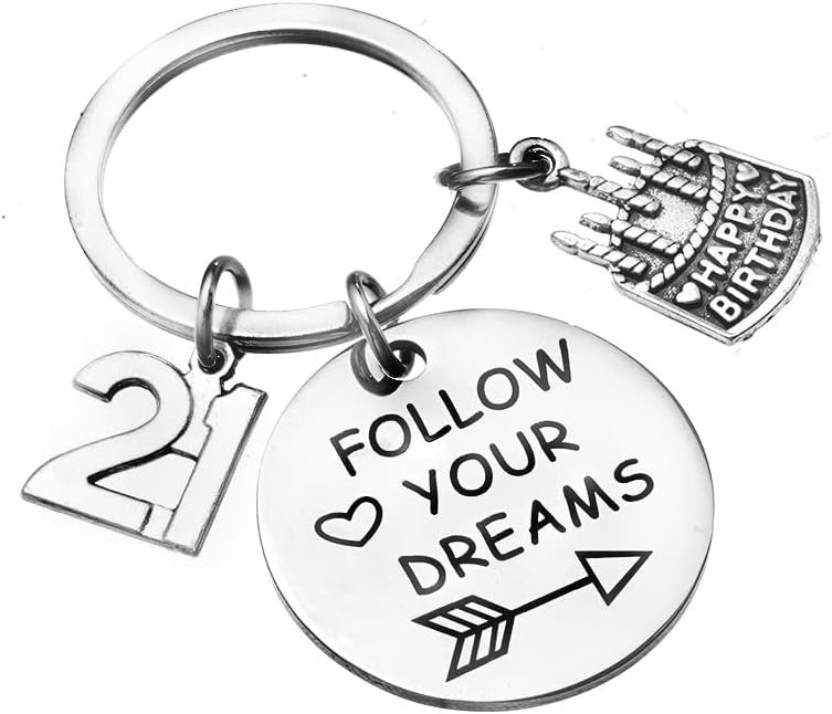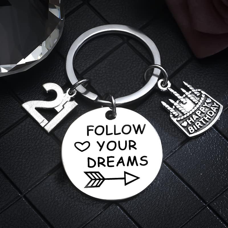 هدية عيد الميلاد الـ 21 للنساء الرجال: سلسلة مفاتيح عيد الميلاد الحادي والعشرين منقوشة بعبارة "اتبع أحلامك"، هدية عيد ميلاد ممتازة لإظهار حبك العميق والتمنيات الطيبة، وجلب الدفء والقوة لابنك البالغ من العمر 21 عاماً