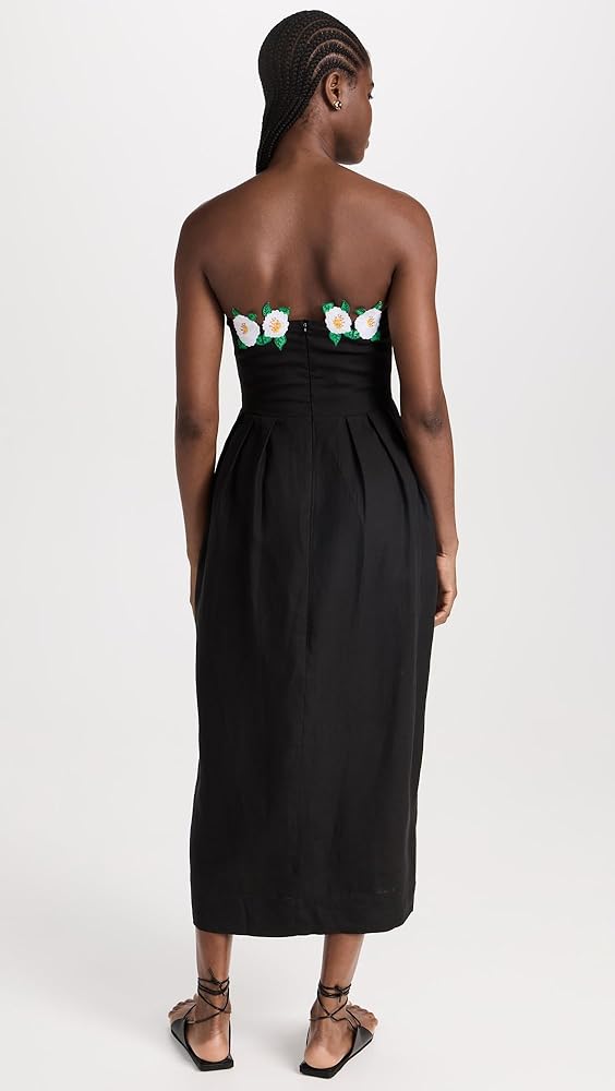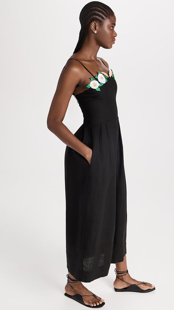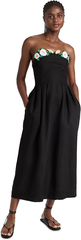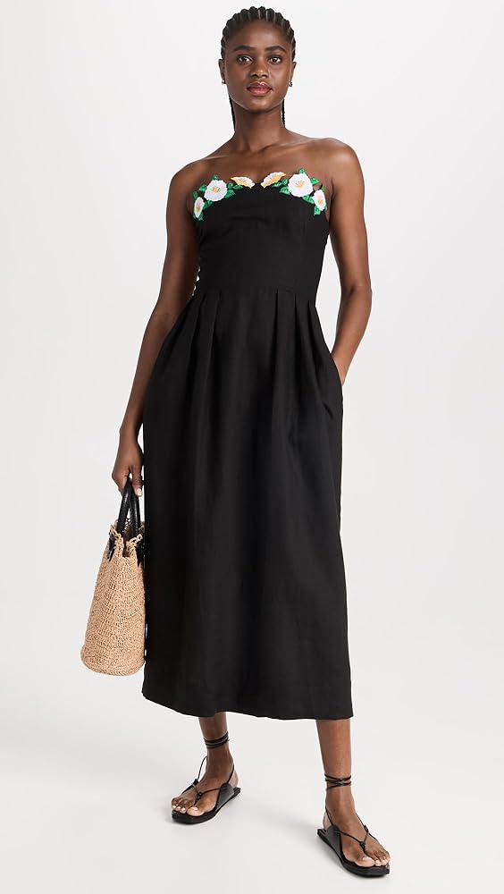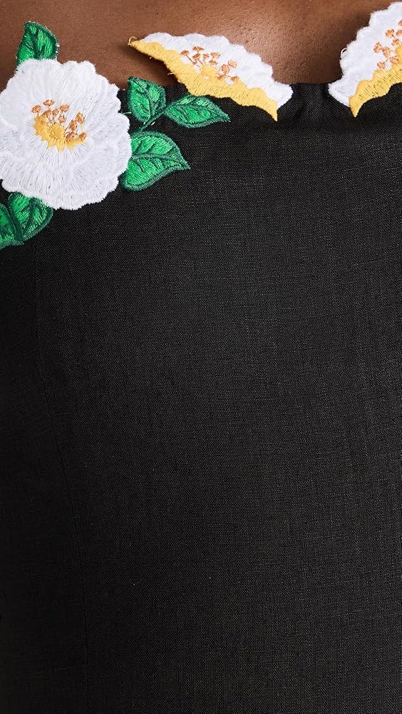 يعمل حسب الحجم. قد ترغب تلك الموجودة بين الأحجام في زيادة حجمها؛ الفستان لا يوفر أي تمدد. ، مصمم بصورة ظلية على شكل حرف A وطول متوسط. يتميز نسيج الكتان بملمس ناعم ويتميز بتطريز زهور على خط العنق بدون حمالات.