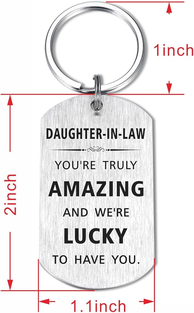 Daughter in Law Keychain - key Ring size 1 inch, pendant size 1.1*2 inches. Made of high-quality stainless steel, it is resistant to distortion, rust, and color fading