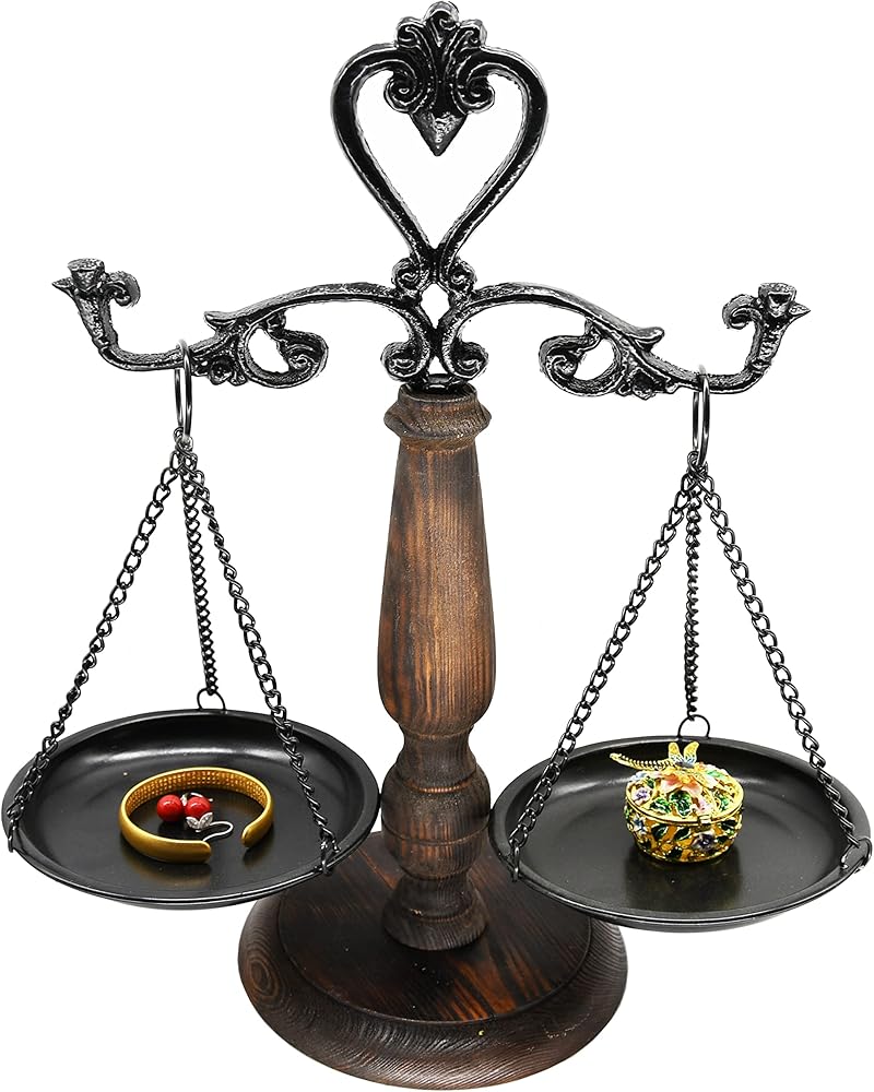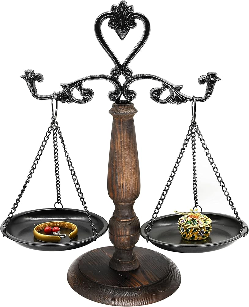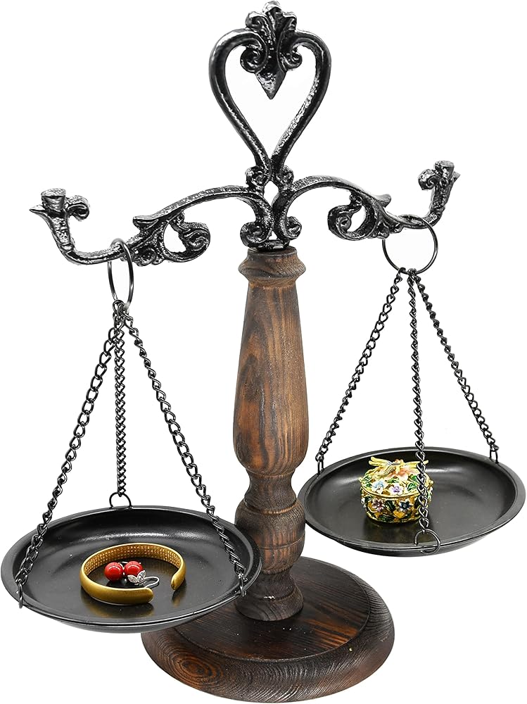 مقياس المحامي المعدني العتيق من Owlgift لميزان العدالة، تخزين المجوهرات المزخرفة، منظم مستحضرات التجميل صينية عتيقة، عرض حامل شموع المزرعة، حامل مركزي لديكور المنزل - أسود، 15 بوصة عرض × 16.5 بوصة ارتفاع