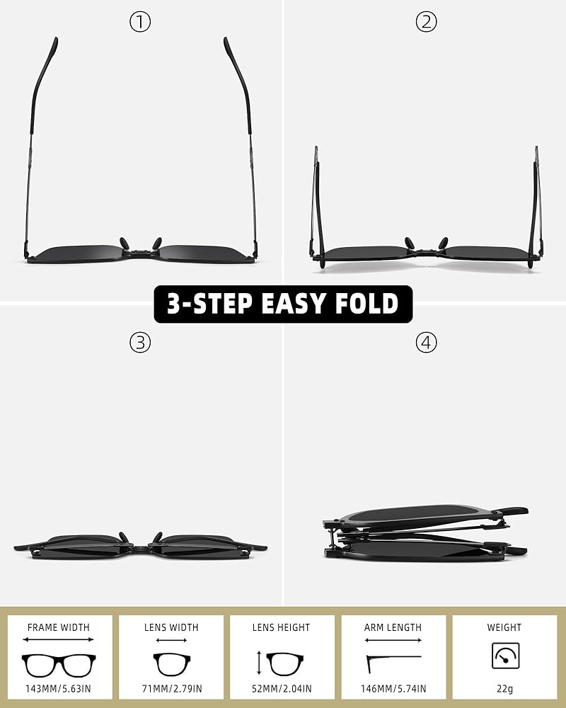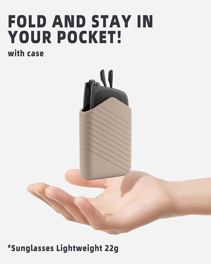 خفيفة الوزن وصغيرة الحجم - تزن نظارتنا الشمسية القابلة للطي 22 جرامًا فقط، وعندما تقوم بطيها، يكون من السهل تخزينها في جيبك أو محفظتك أو حقيبة الظهر دون أن تشغل مساحة كبيرة.
