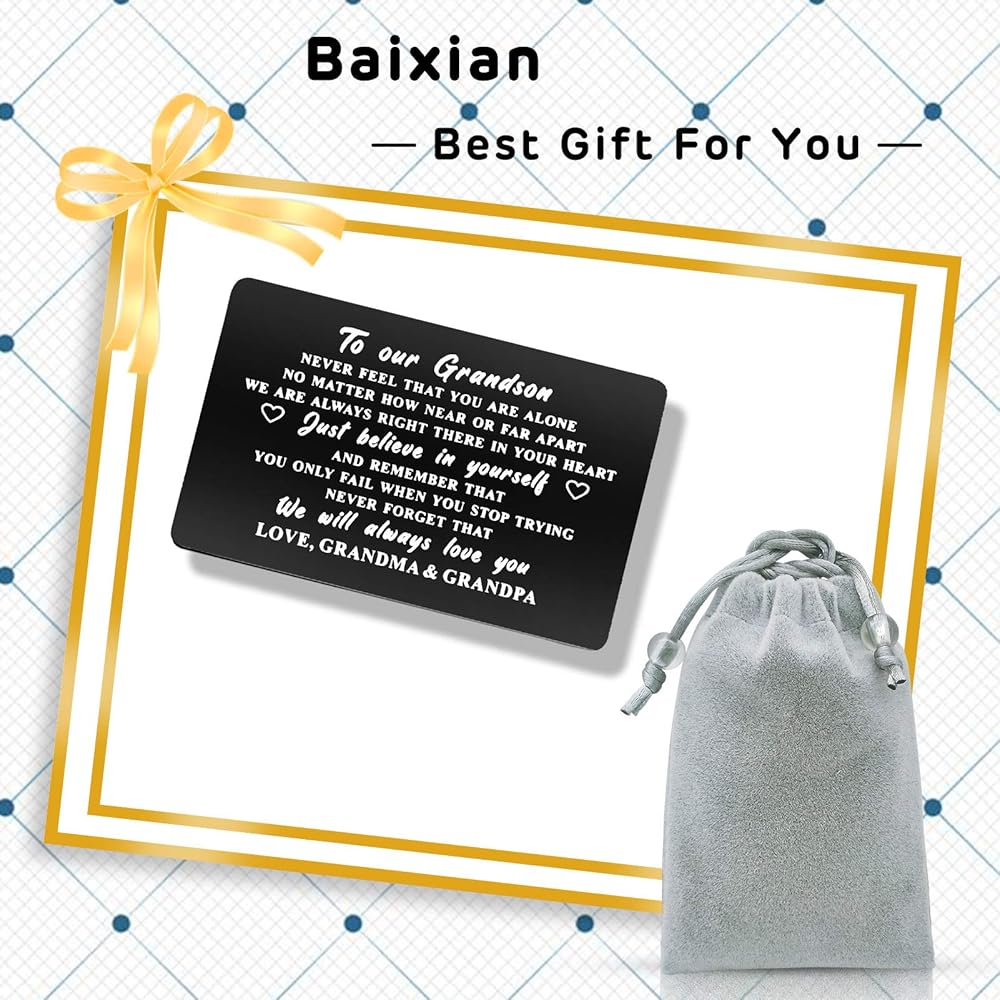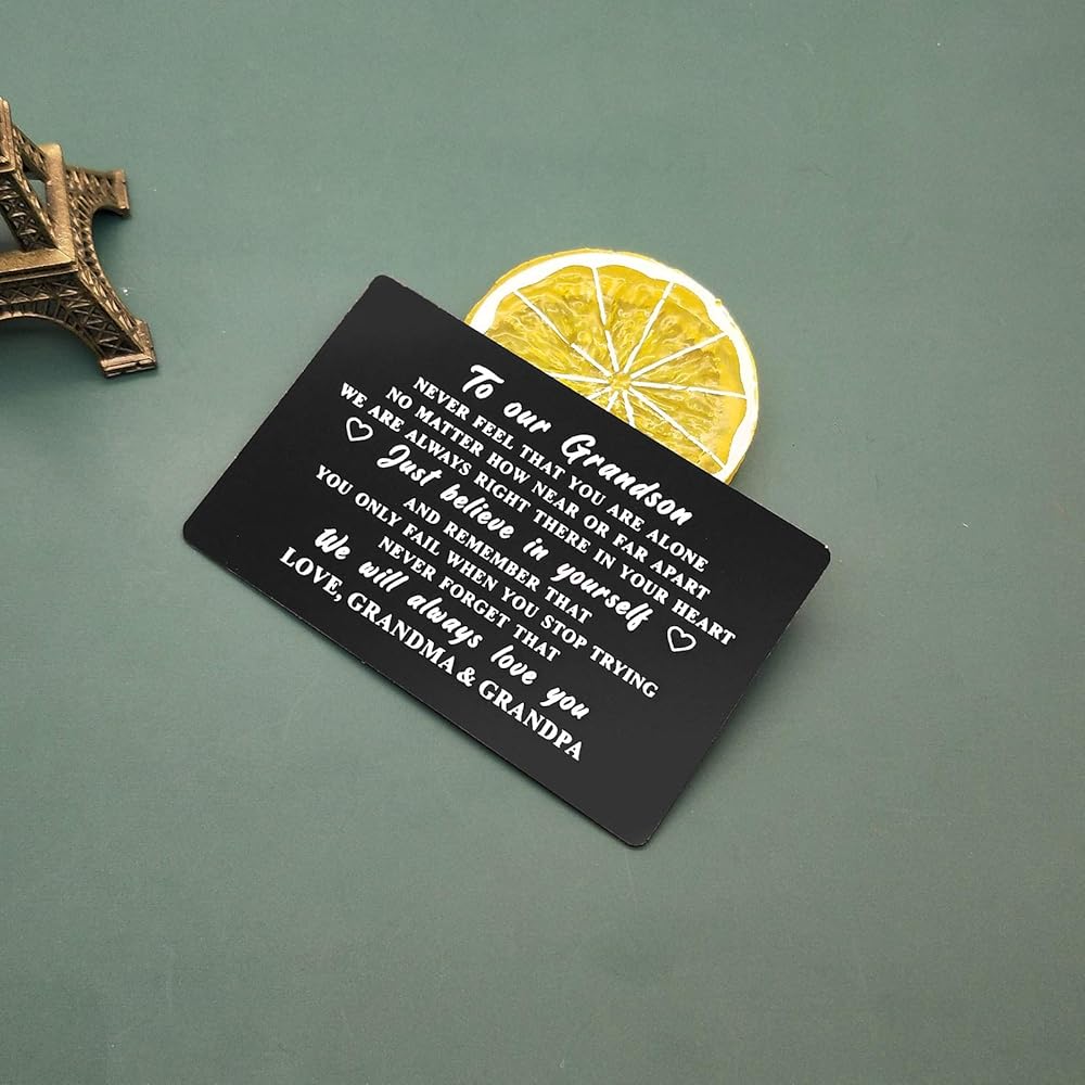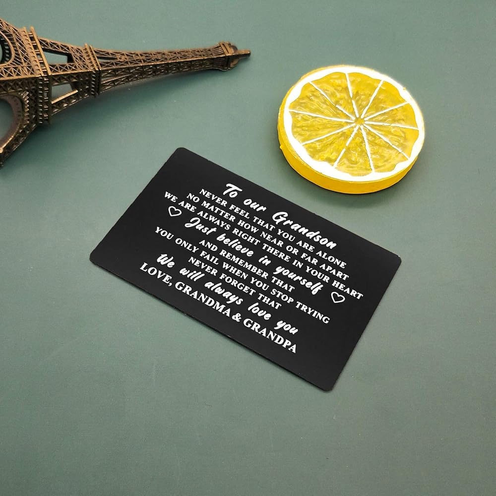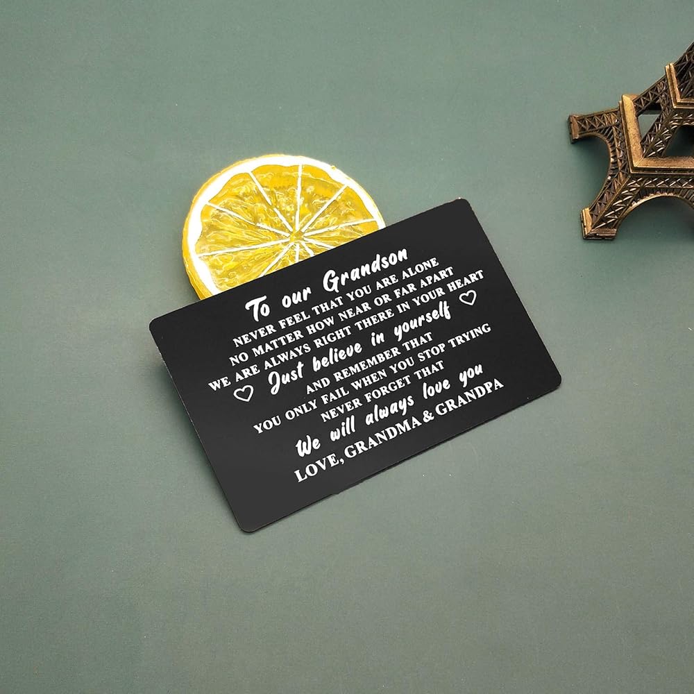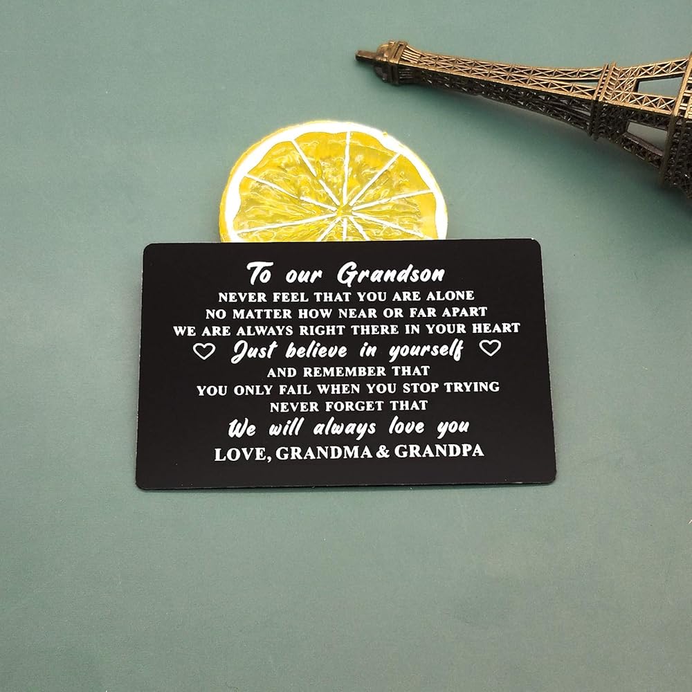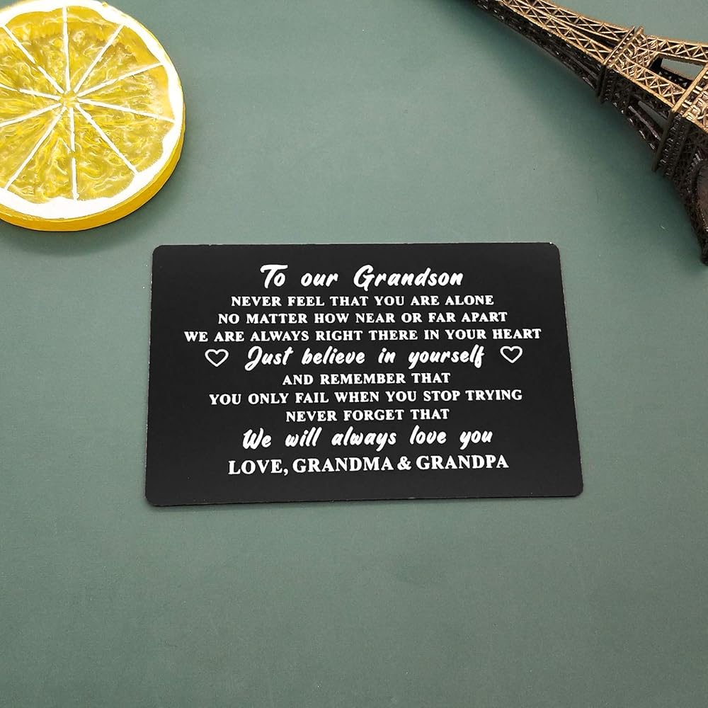 بطاقة هدايا الحفيد من الجدة الجد - لا تشعر أبدًا بأنك وحدك. بغض النظر عن مدى قربنا أو بعيدًا، فنحن دائمًا في قلبك. فقط ثق بنفسك، وتذكر أنك لا تفشل إلا عندما تتوقف عن المحاولة. لا تنسى أبدًا أننا سوف نحبك دائمًا. لوف الجدة والجد.