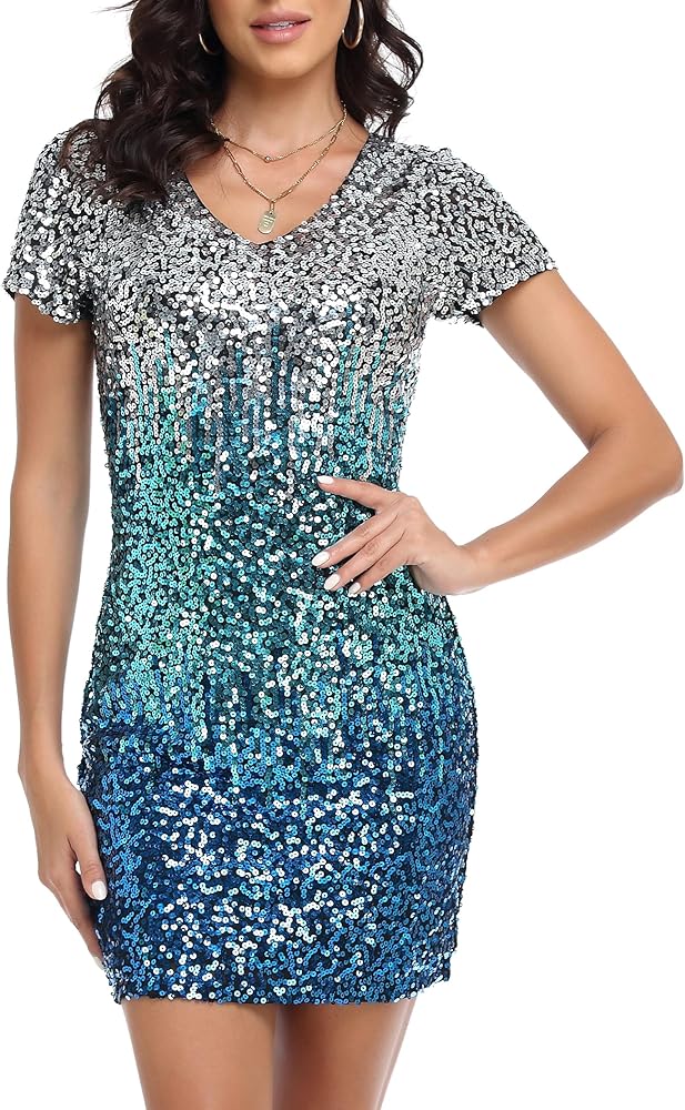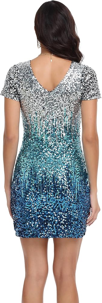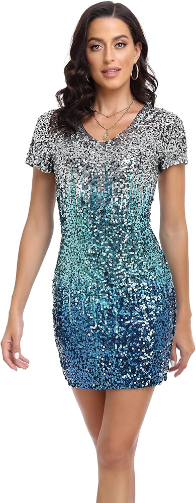 Glittering sequins create a gorgeous effect on this twinkling sequin dress with short sleeve design. Softly hued sequins shimmer and shine throughout sheer mesh fabric overlay the smooth kint lining, sparkling while skin-friendly. Features a deep v neckline with same deep v back in mini length short sleeve slim fit silhouette, sultry v neck perfectly show off your slender neckline, ultry sexy and feminine. With above knee length, figure-hugging clipping style will show your charming features, pair with high heels, necklace and hand bag to complete your fashion and eye-catching night out look, flattering sequin cocktail dresses for women evening party, perfect for party, club, disco, cocktail, night out, dinner, evening, bachelorette party, performance, banquet, wedding, ball, prom, Christmas, homecoming, NYE or other special occasion.