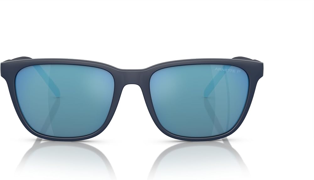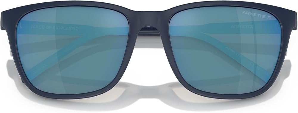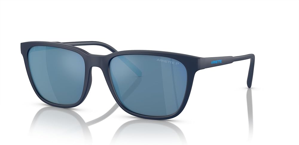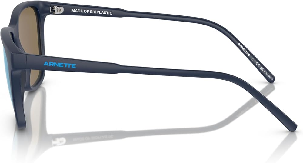 ميزات الإطار: تتميز النظارات الشمسية AN4291 Cortex بإطار مربع من البلاستيك الحيوي باللون الأزرق الداكن غير اللامع وتصميم ذراع رفيع جديد مع شعار ارنيت وعدسات مستقطبة مائية عاكسة باللون الرمادي الداكن.