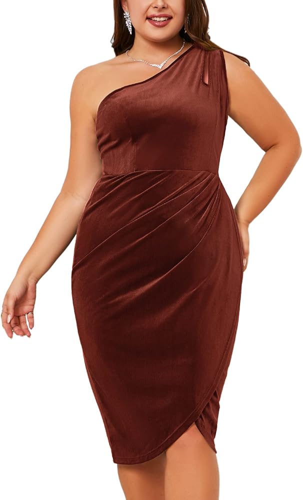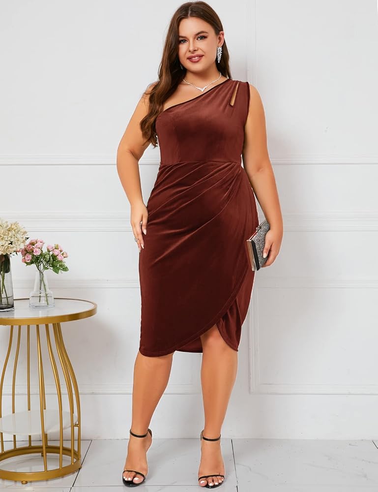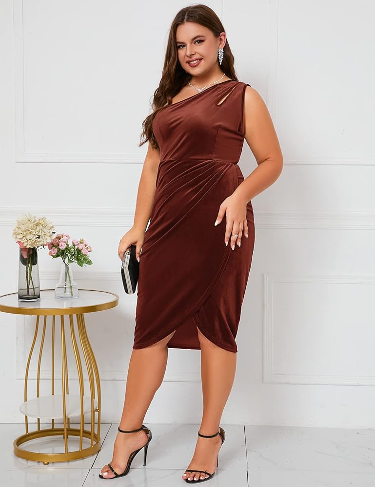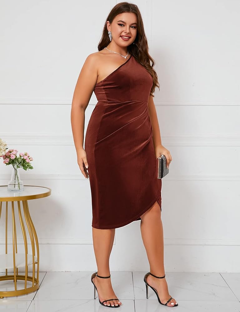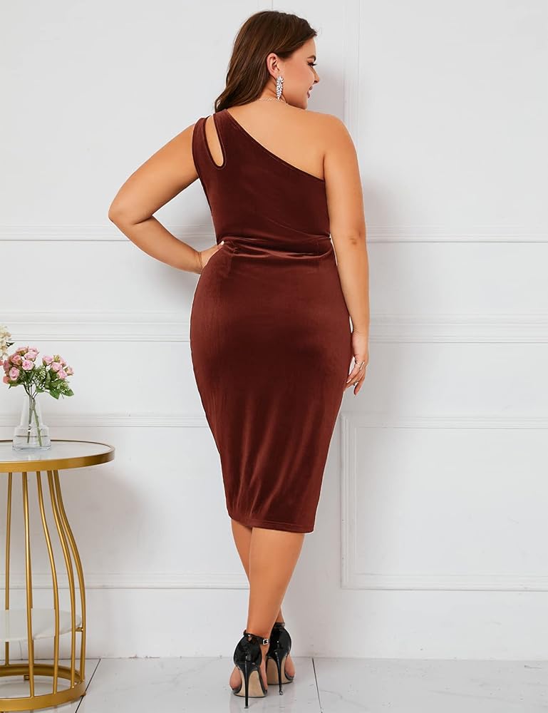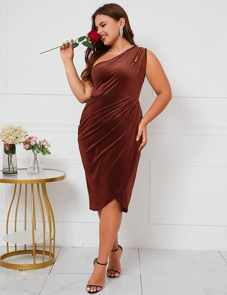 النمط: هذا الفستان المخملي غير المتماثل مع تصميم بفتحة كتف واحد وخصر مكشكش ونمط بودي كون متوسط الطول يجعلك تبدين فريدة وأنيقة، مما يظهر منحنياتك الساحرة بشكل مثالي.
