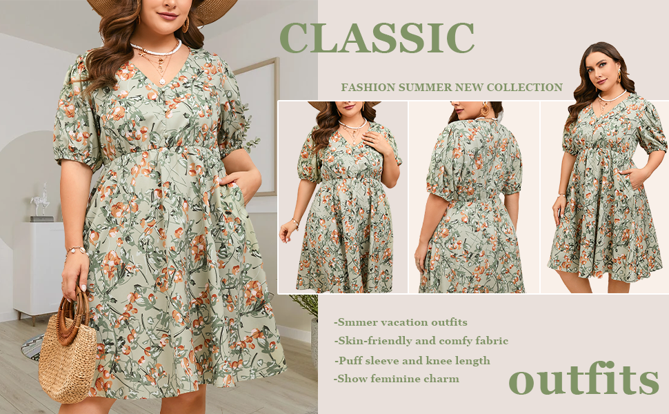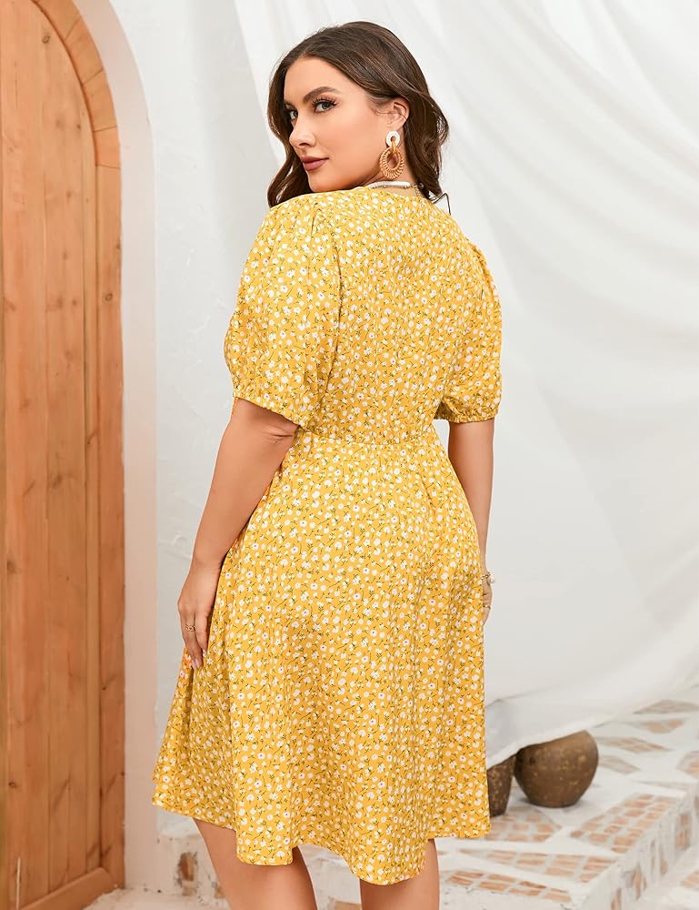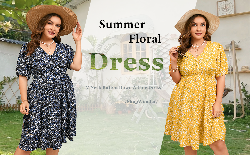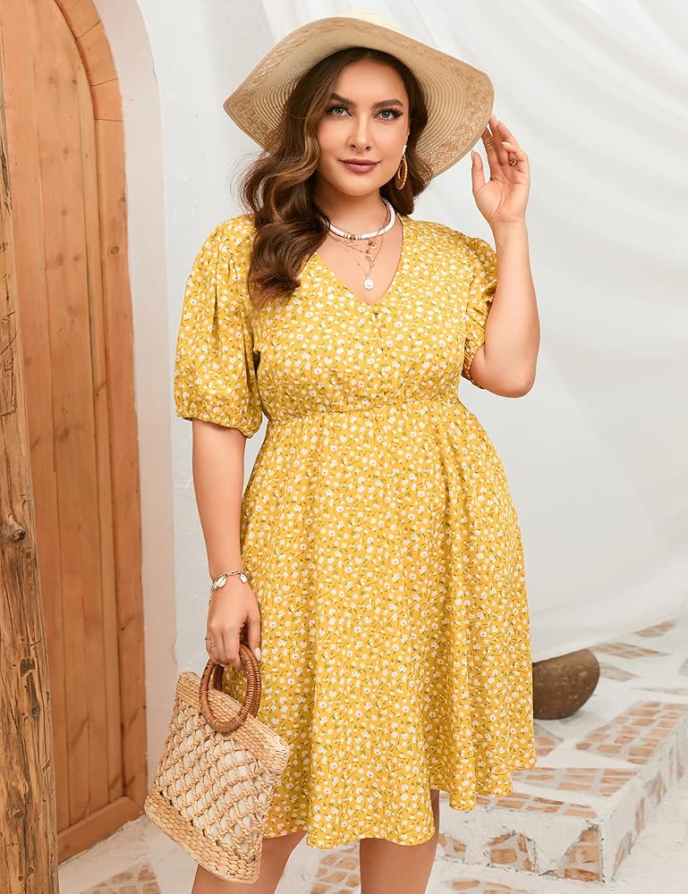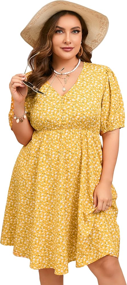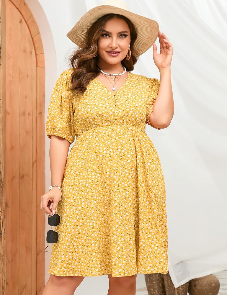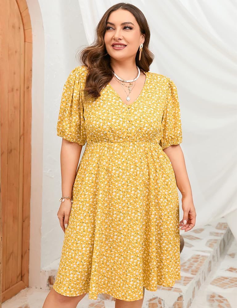 فستان ShopWonder صيفي مقاس كبير للنساء مقاس كبير ورقبة على شكل V فستان زهري وأكمام منتفخة مع جيوب