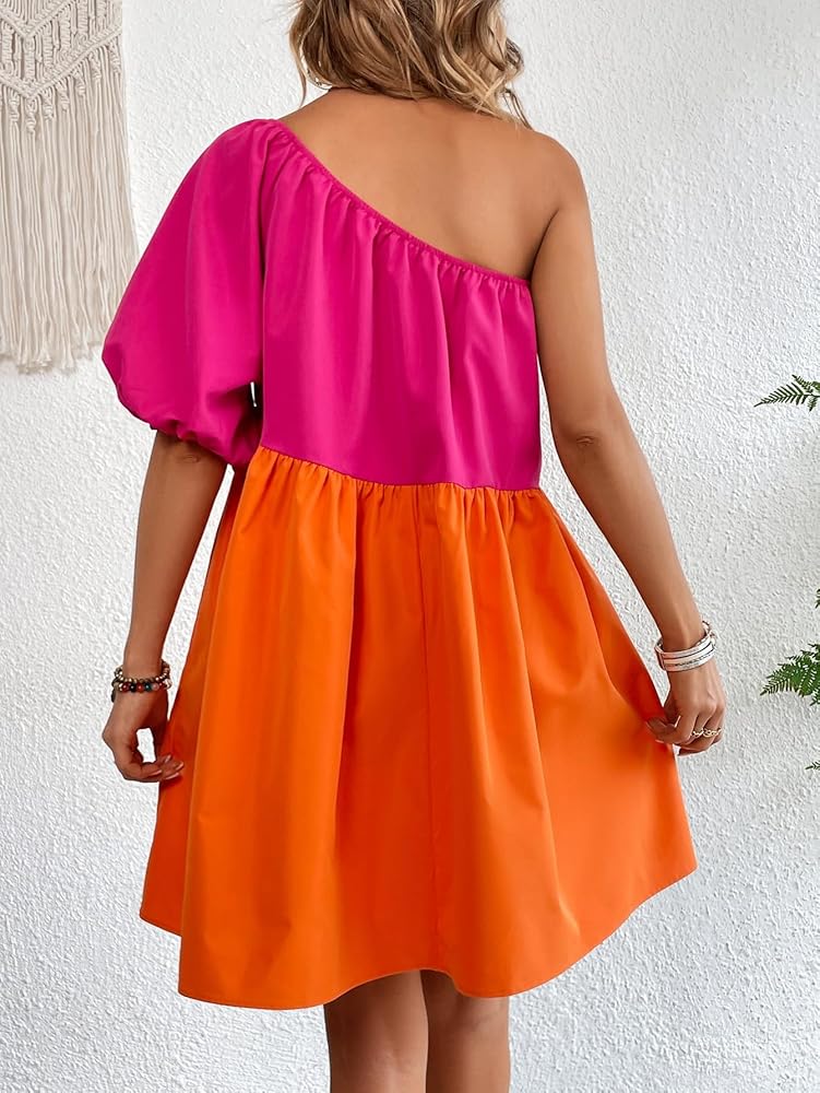 فستان نسائي قصير من WDIRARA بكتف واحد وكتلة ملونة وأكمام منتفخة وفضفاضة