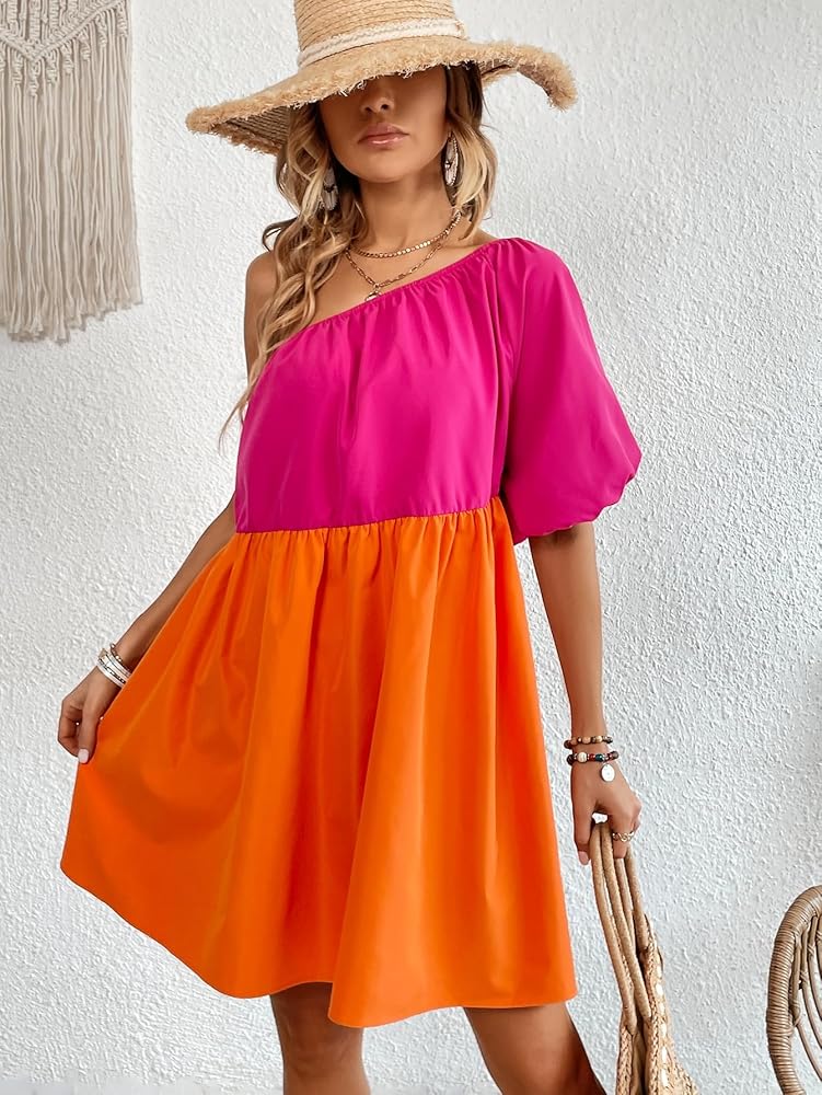 • المزايا: كتلة الألوان، كتف واحد، فستان تونيك، كم قصير منتفخ، حاشية واسعة، فستان قصير