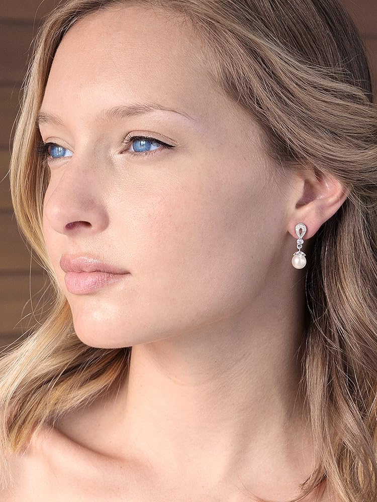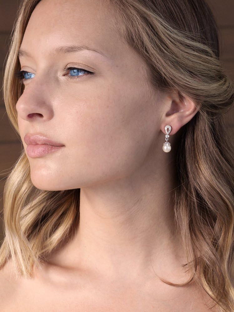 - تتميز أقراط الزفاف ذات قطرة اللؤلؤ العتيقة من Mariell بتصميم آرت ديكو المكعب من الزركونيا؛ الأكثر مبيعا لمجوهرات الزفاف