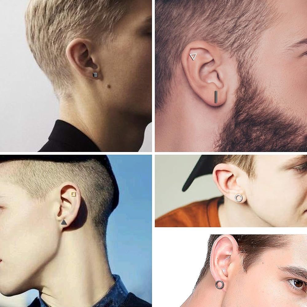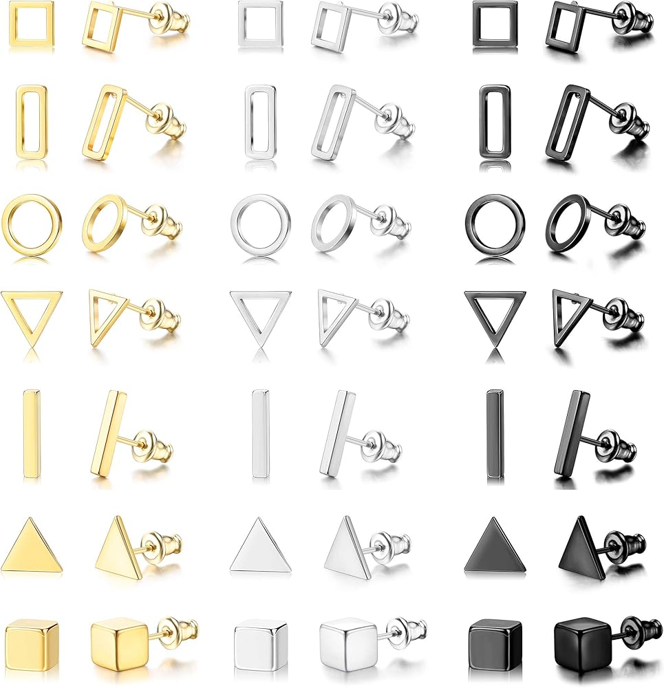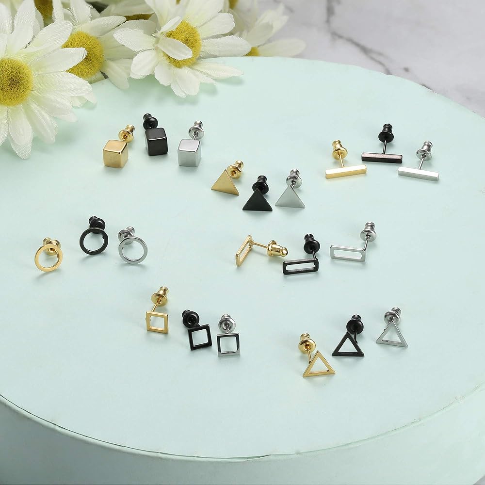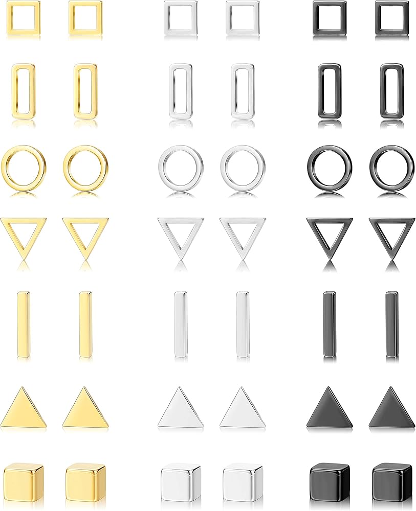 [مجموعة الأقراط المرصعة الهندسية]: ستحصل على 21 زوجًا من الأقراط المرصعة المصنوعة من الفولاذ المقاوم للصدأ، بما في ذلك الأقراط المثلثة والأقراط الدائرية البسيطة والأقراط المستطيلة ومجموعات الأقراط المربعة. الأسود والفضي وثلاثة ألوان ذهبية في 7 أنماط مختلفة، مناسبة لكل من الرجال والنساء.