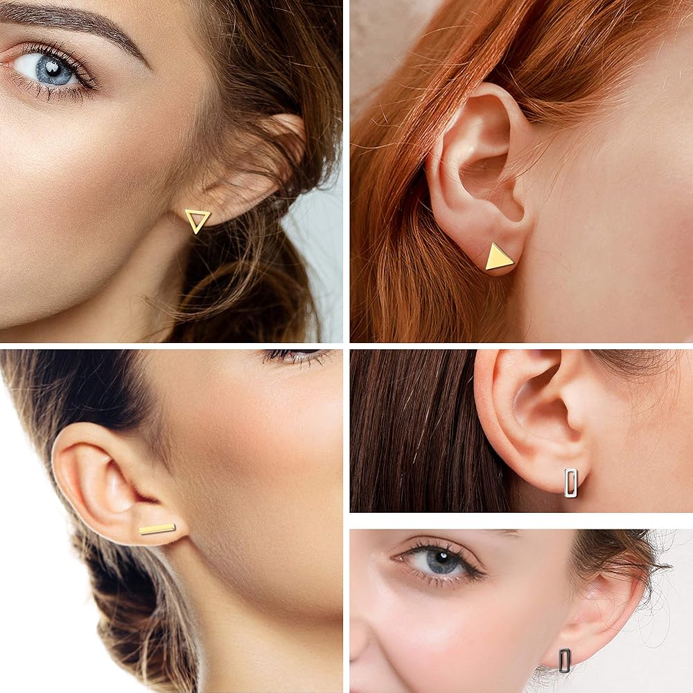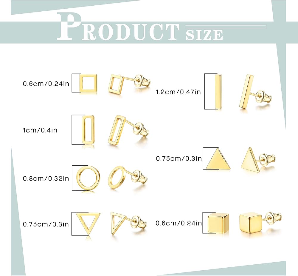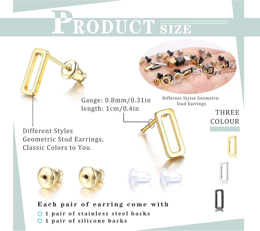 [الأحجام المناسبة]: ترصيع مثلث 0.75 سم (0.3 بوصة) ، أقراط دائرية 0.8 سم (0.32 بوصة) ، أقراط مستطيلة 1 سم (0.4 بوصة) ، مجموعات الأقراط مربعة 0.6 سم (0.24 بوصة) ، مجموعات أقراط القضبان 1.2 سم (0.47 بوصة) ، أقراط صغيرة وبسيطة هندسية مناسبة للارتداء لفترة طويلة ، مثالية للسفر ، النوم ، المواعدة ، الحفلات وما إلى ذلك.