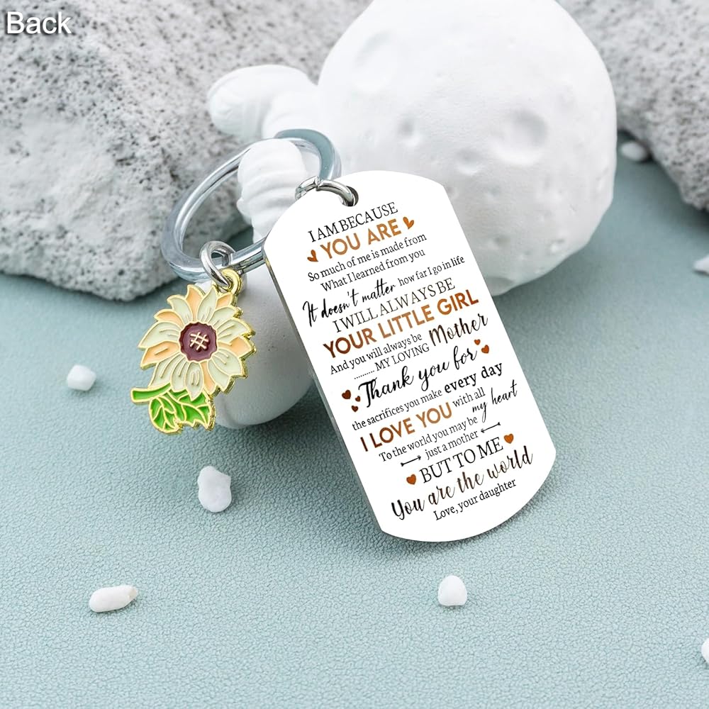 💕Sunflower Keychain: The keychain is paired with a small sunflower flower accessory, which can easily win your mother's favor. The keychain is made of hypoallergenic stainless steel. The text is clear and will not fade. It can be given to your mother with confidence. It is a gift that will last a lifetime. It is widely used, not only as a simple keychain, but also as a decoration on a schoolbag. It is cheap, beautiful and practical.