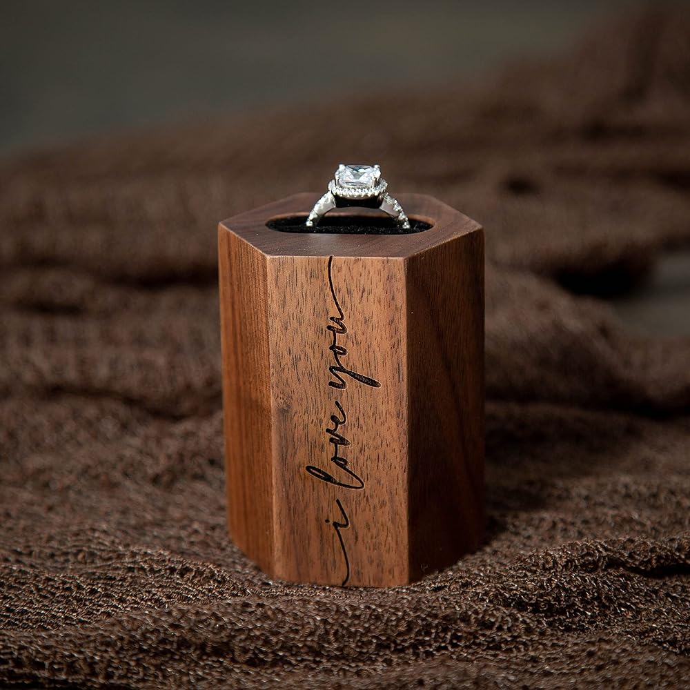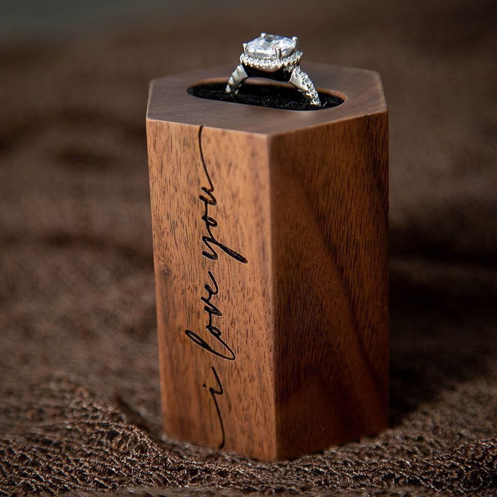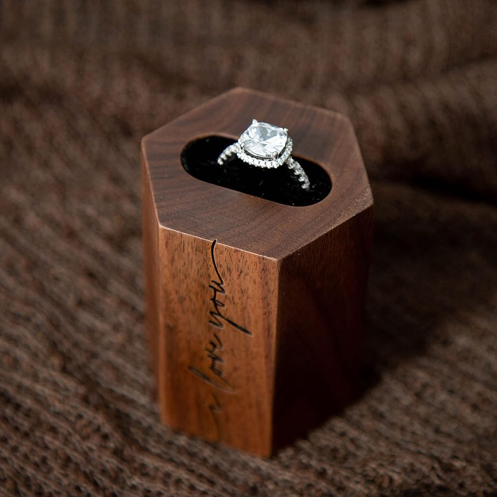 حامل حلقي أنيق وعملي مصنوع من خشب الجوز الداكن عالي الجودة. مزود بإسفنج مخملي أسود فاتن لجعل هذا الخاتم لامعًا. تصميم عصري لا يتأثر بمرور الزمن.