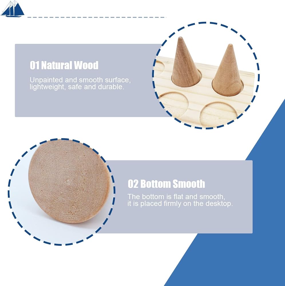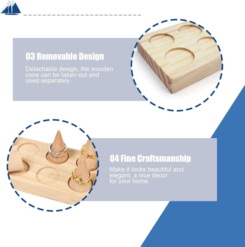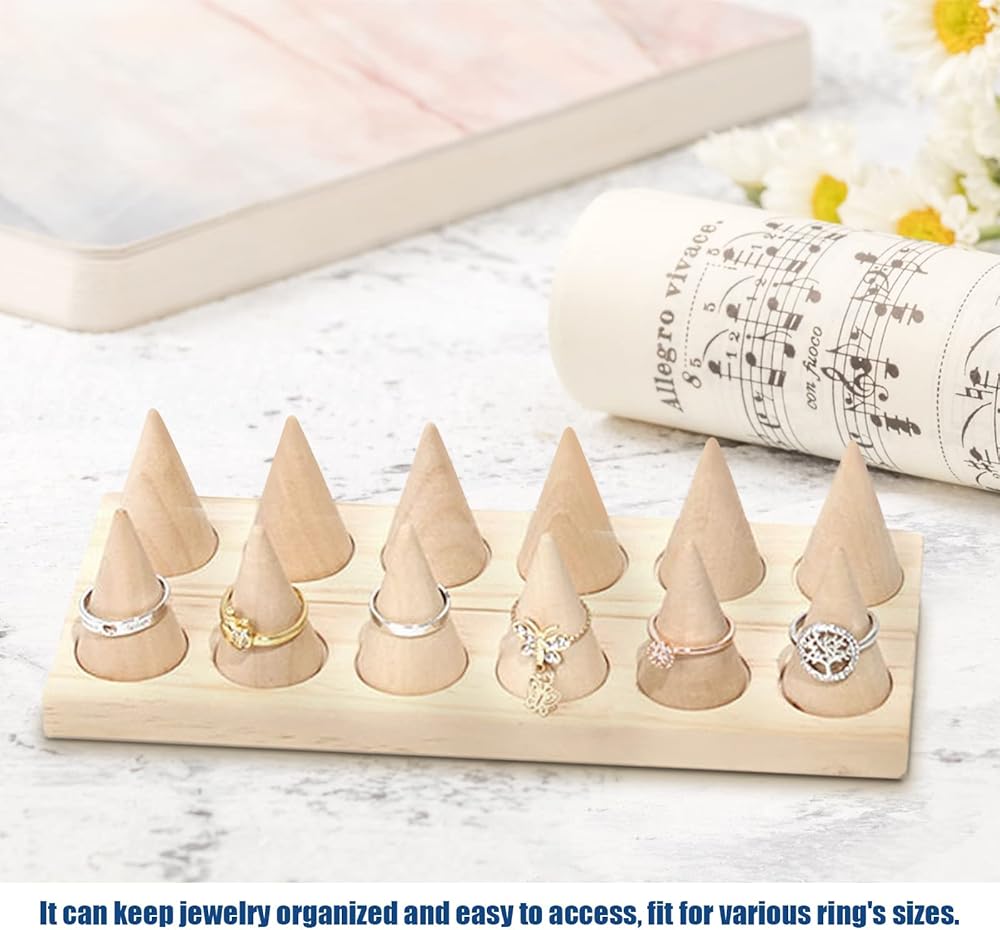 • 【REMOVABLE DESIGN】Wooden cone shape holder and base are detachable, and the wooden cone can be taken out and used separately. Put it on the base, it is convenient to move and save space, keeps every jewelry organized and easy to access, fit for various ring's sizes.