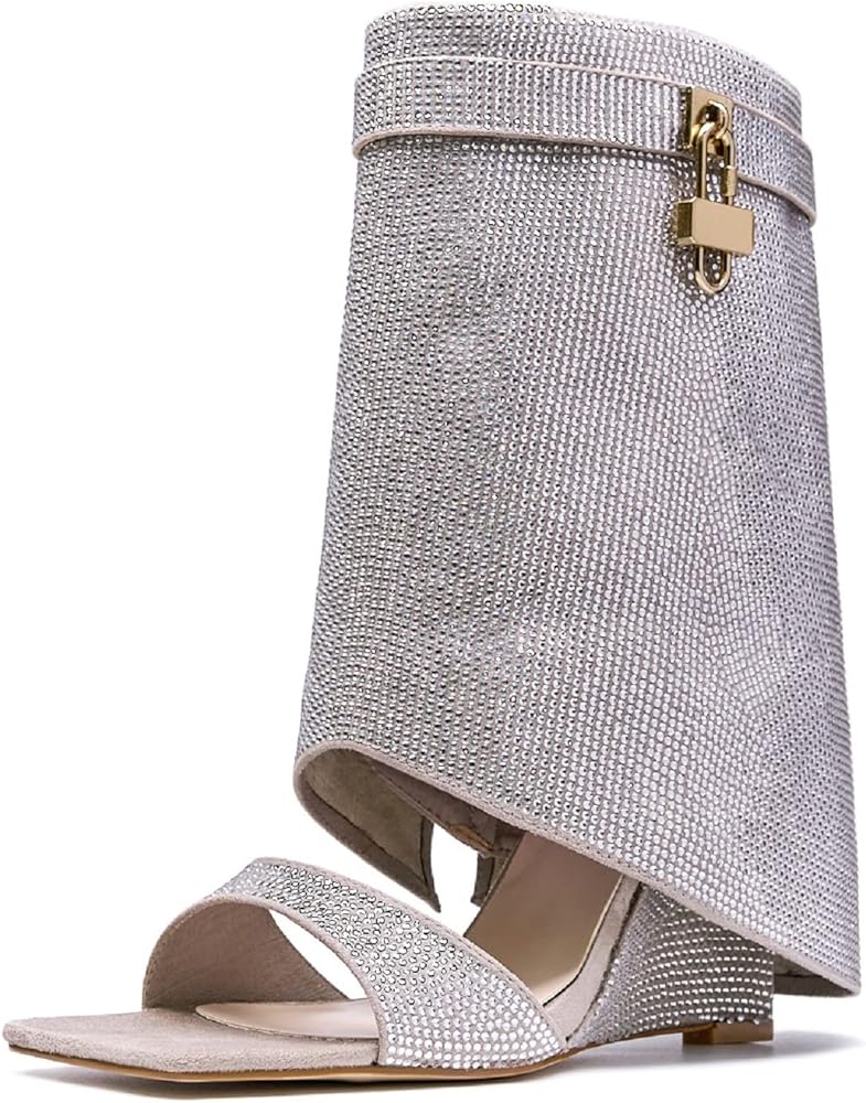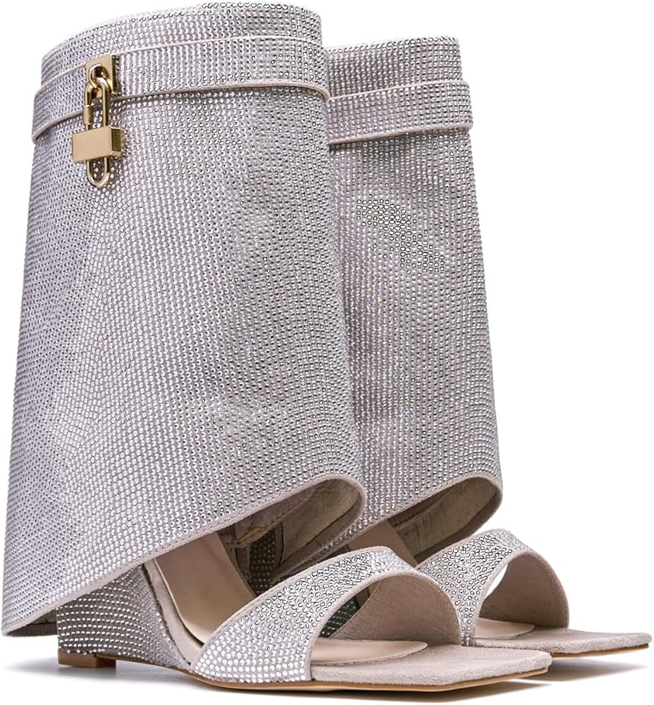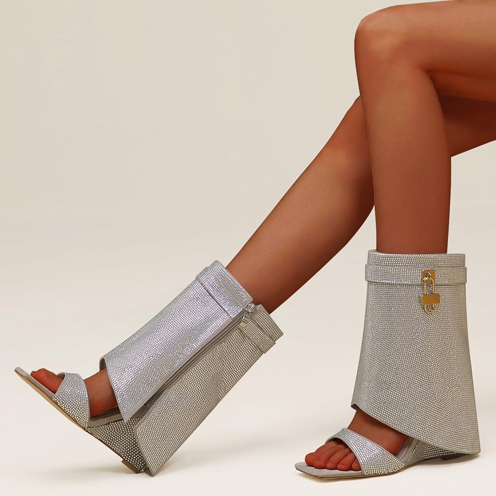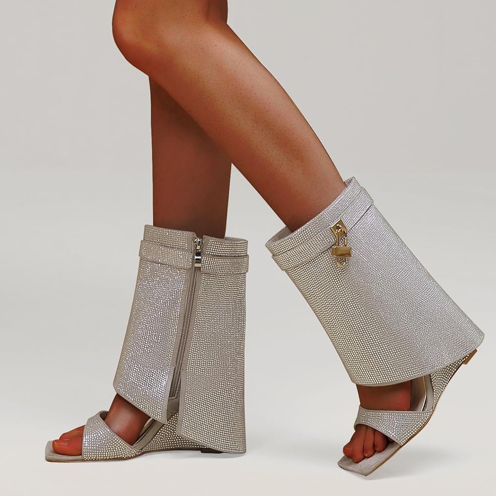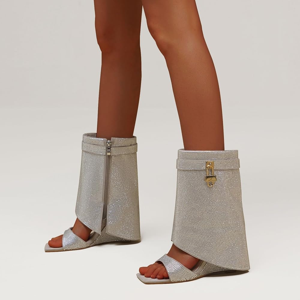 • These rhinestones boots are feature a unique combination of wedge heel,fold over,square toe,metal padlock and glitter rhinestones,making them a must-have for any fashion-forward women.