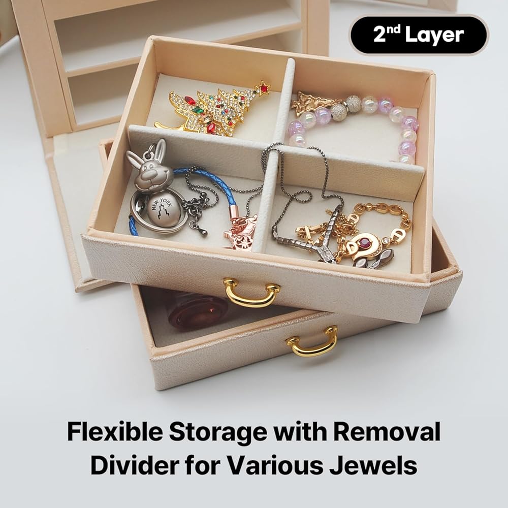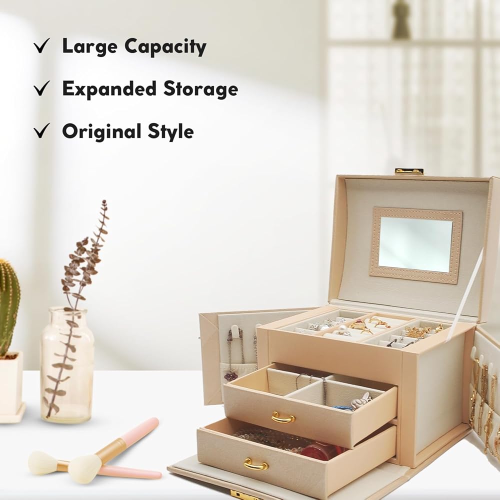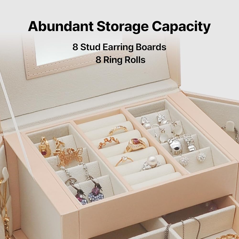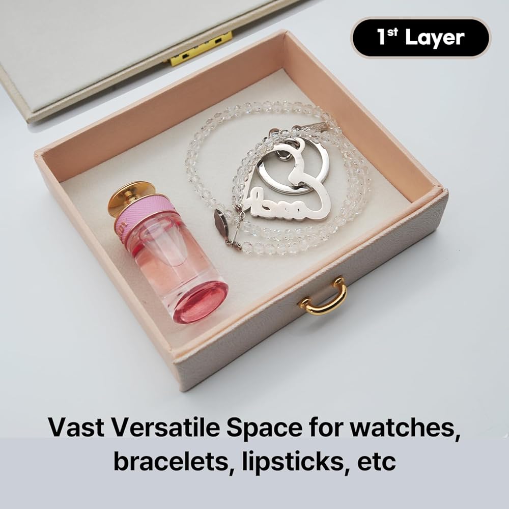 😍 [واحة تخزين متعددة الاستخدامات]: أطلق العنان لإمكانات مجموعة مجوهراتك مع هذا الصندوق المكون من ثلاث طبقات والذي يتميز بأقسام متخصصة، بما في ذلك لوحتين للأقراط، و8 فتحات للحلقات، ودرجين للساعات والأساور وأحمر الشفاه والمزيد. استمتع بالمساحة الواسعة والمنظمة التي توفرها لتزييناتك الثمينة.