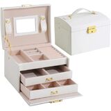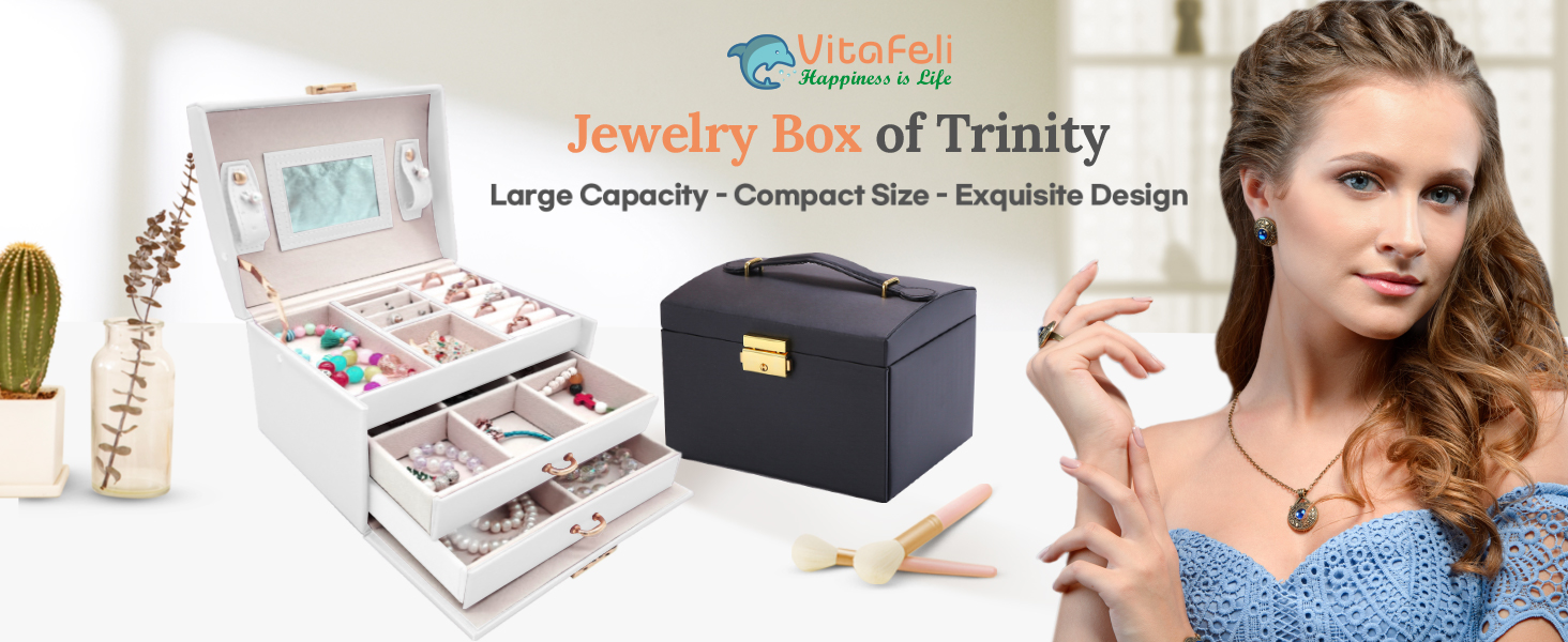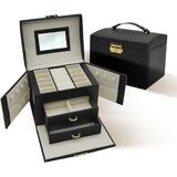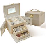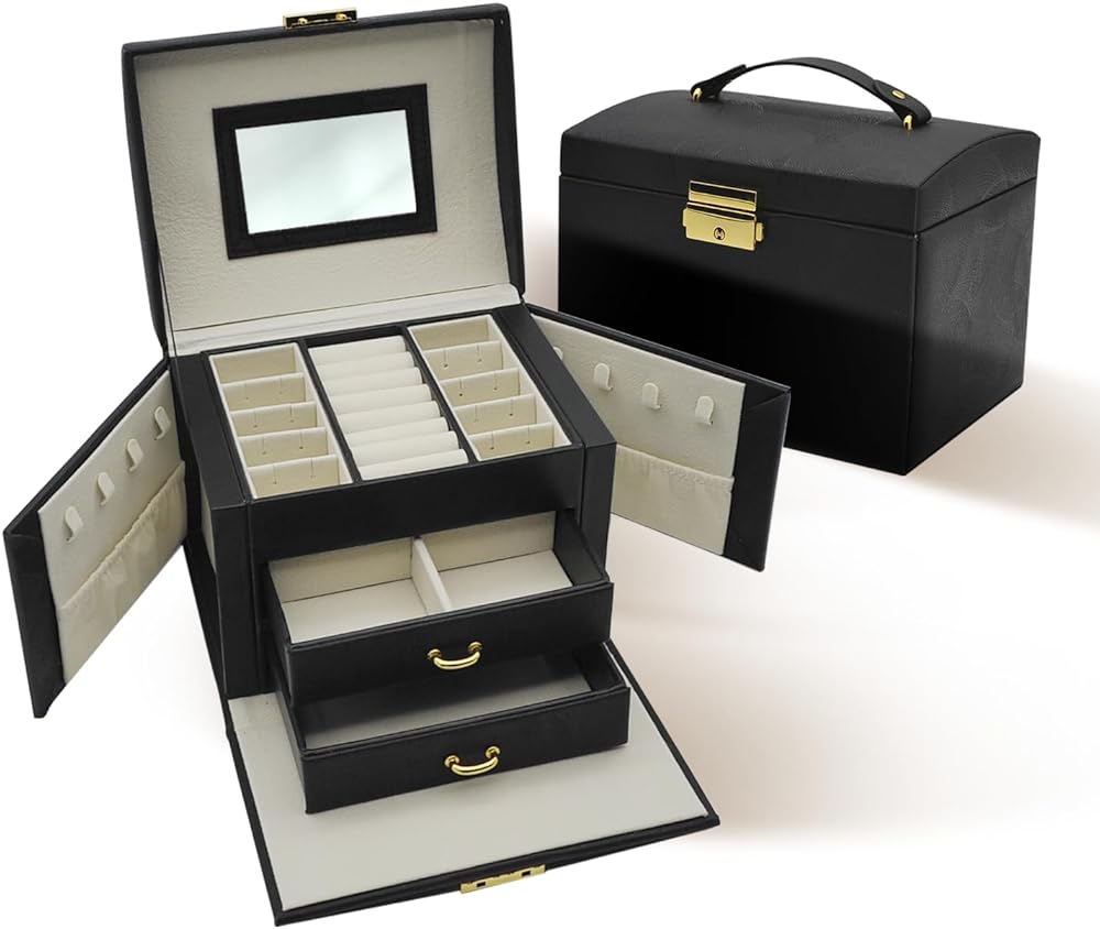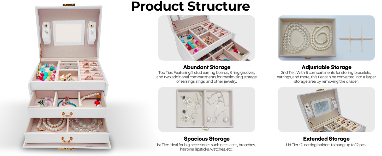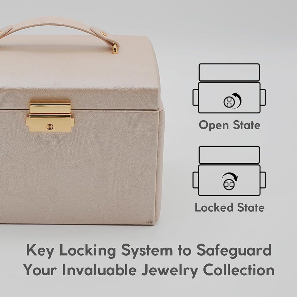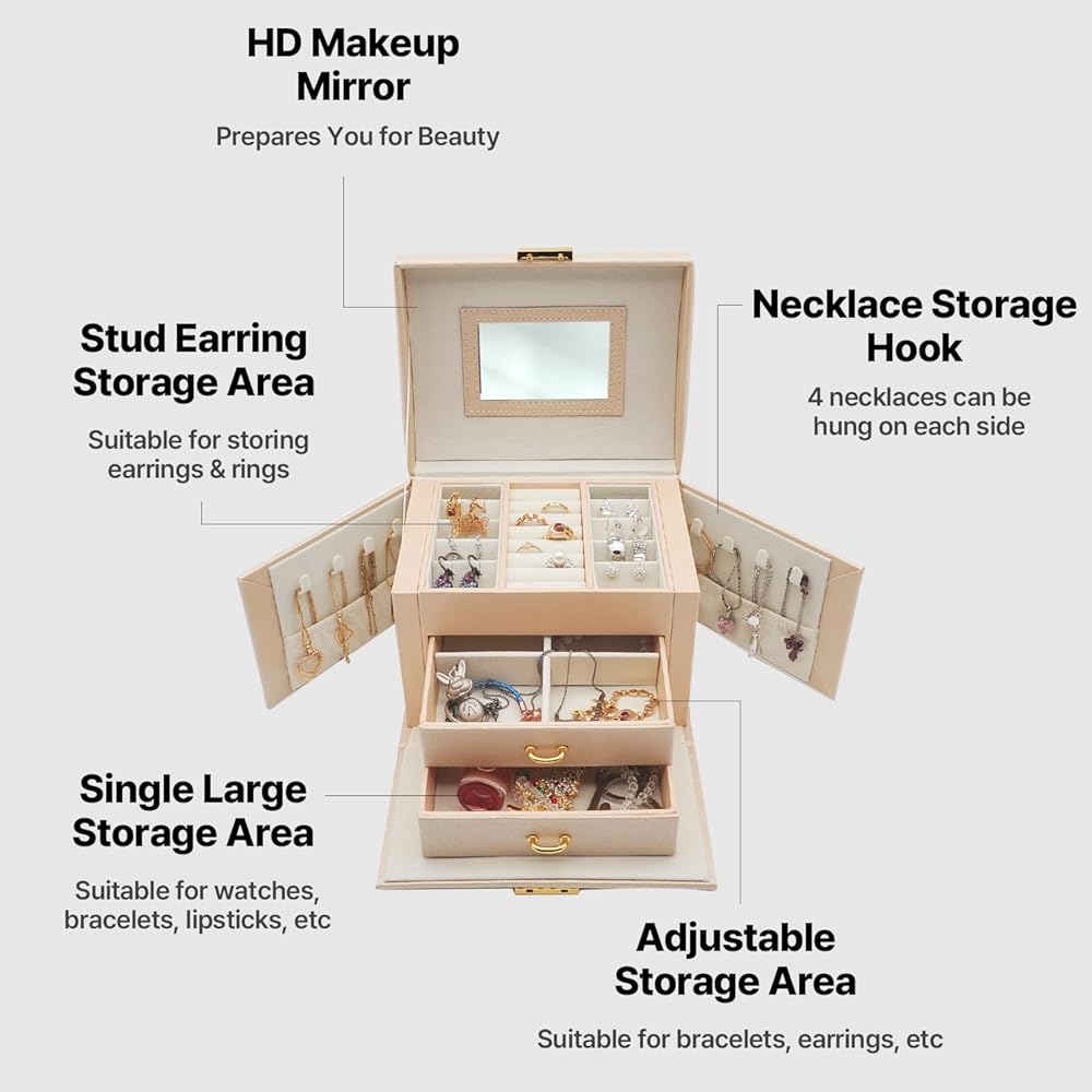 😍 [واحة تخزين متعددة الاستخدامات]: أطلق العنان لإمكانات مجموعة مجوهراتك مع هذا الصندوق المكون من ثلاث طبقات والذي يتميز بأقسام متخصصة، بما في ذلك لوحتين للأقراط، و8 فتحات للحلقات، ودرجين للساعات والأساور وأحمر الشفاه والمزيد. استمتع بالمساحة الواسعة والمنظمة التي توفرها لتزييناتك الثمينة.