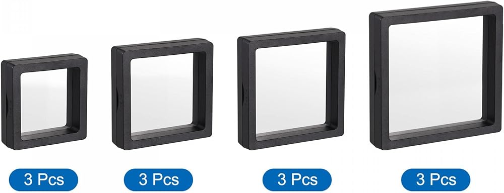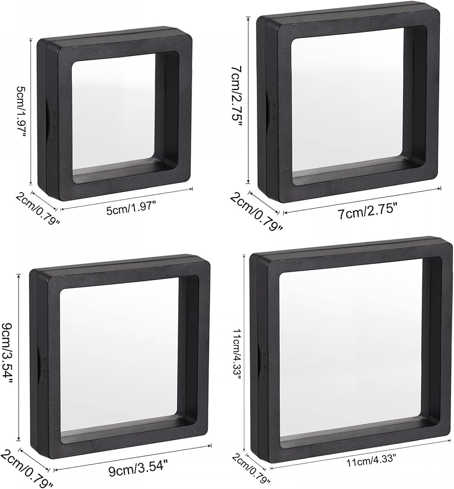The display storage box, in size of: Size: 5cm x 5cm x 2cm/1.97 inch x 1.97 inch x 0.79 inch(L*W*H), 7cm x 7cm x 2cm/2.75 inch x 2.75 inch x 0.79 inch, 9cm x 9cm x 2cm/3.54 inch x 3.54 inch x 0.79 inch, 11cm x 11cm x 2cm/4.33 inch x 4.33 inch x 0.79 inch; Color: Black; Shape: Square