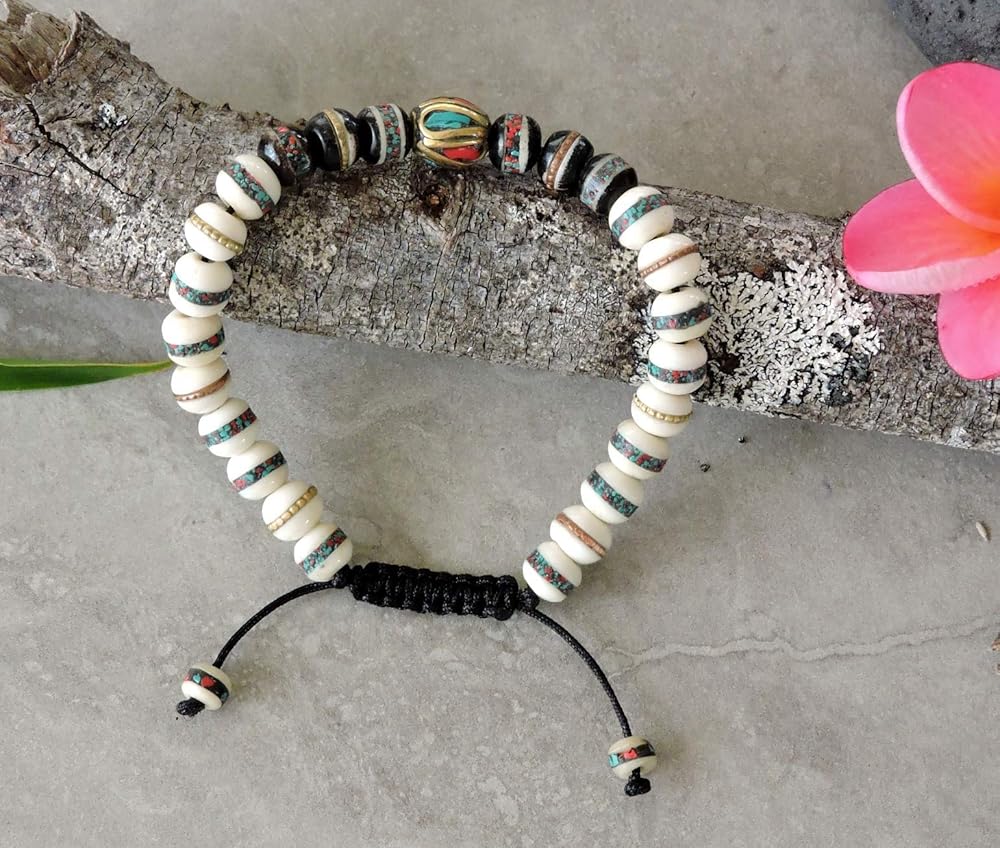 This listing is for a healing wrist mala with a classic combination of white and black embedded yak bone medicine beads and a coral/turquoise inlaid bead. The yak bone beads are embedded with copper, nickel, brass and turquoise and coral. Yaks have played a significant role in Tibetan culture and lifestyle for centuries by being used for transportation of goods, yak hair is used for fabrics and rope, and yak milk is used for cheese and butter. Yak bone represents impermanence and is said to mai