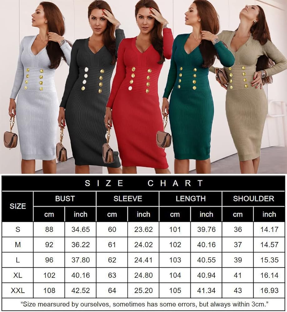 Features: Long Sleeve, Deep V Neck, Metal Buttons Decor in the Waist looks Fresh and Delicated, Solid Color, Slim Fit, Midi Length, Bodycon Style.