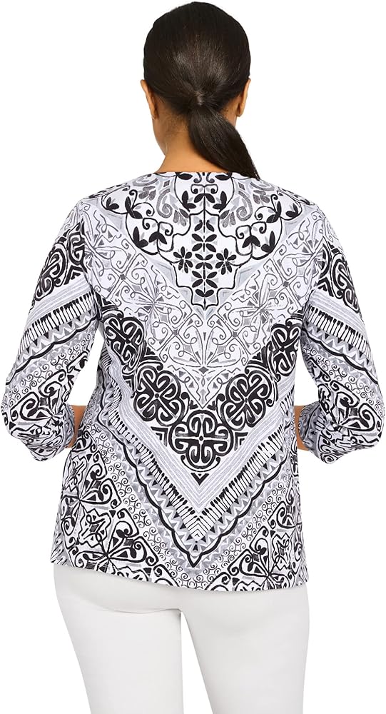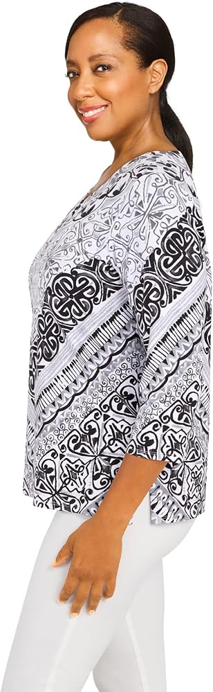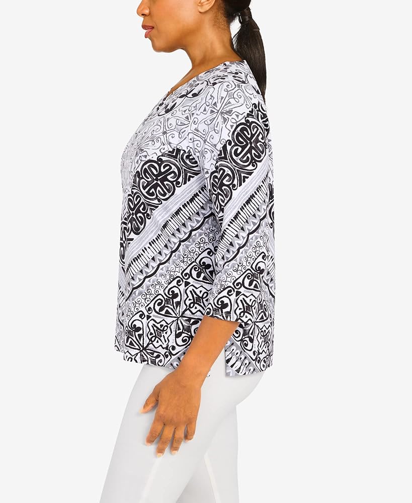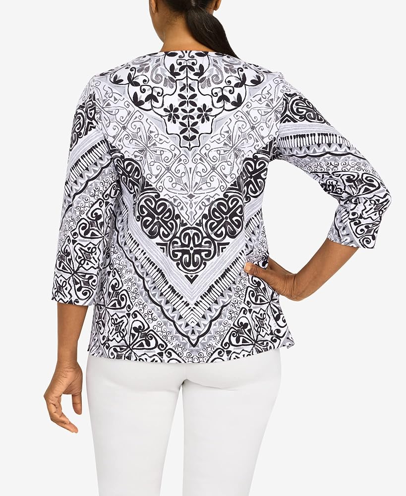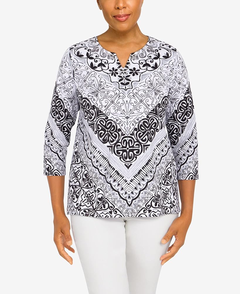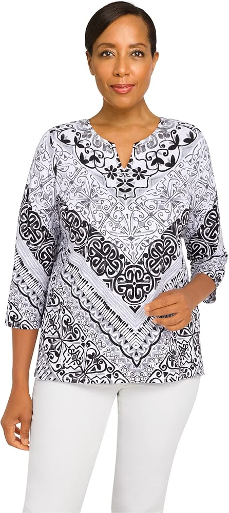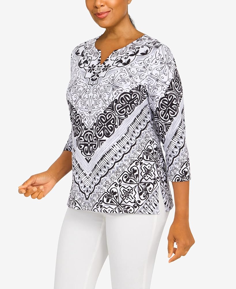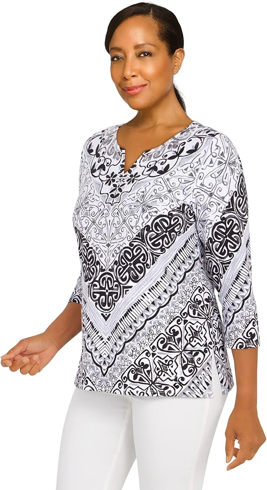 Alfred Dunner Classic Cotton Chevron Scroll Knit top Split Neck