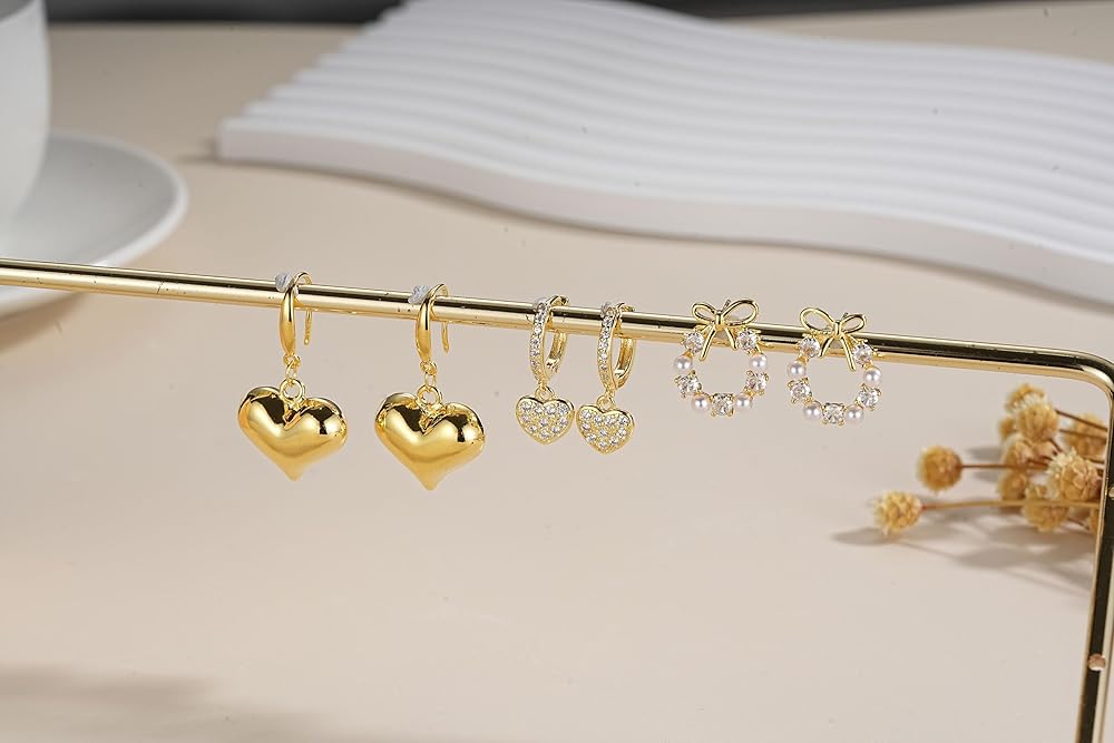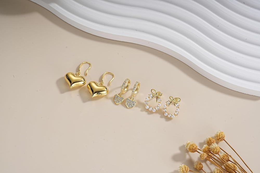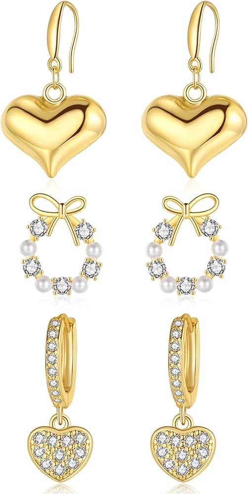 ZRU 3 Pairs Sterling Silver Stud Dangle Earrings Set for Women Hypoallergenic 925 Silver Ribbon Bow Pearl CZ Stud Earrings Huggie Hoops Heart Dangle Earrings Trendy Gifts Color:gold. Silver Stud Earrings Set: 3 pairs a set, this sparkling silver earrings set include ribbon bow pearl stud earrings paved with cubic zironia, a huggie hoop dangle earrings paved with heart cz and a heart dangle earrings. Meterial: made of high quality copper, 925 sterling silver post, 18k gold plated metal with sparkling rhinestones inlaid. Packaged: with a velvet bag. Occasion: any accasion, such as party, wedding, birthday and travel,etc. Chic Gifts: Perfect gifts for valentines, Christmas, birthday, mother's day, wedding, graduation, anniversary, prom, party, fashion week, etc.