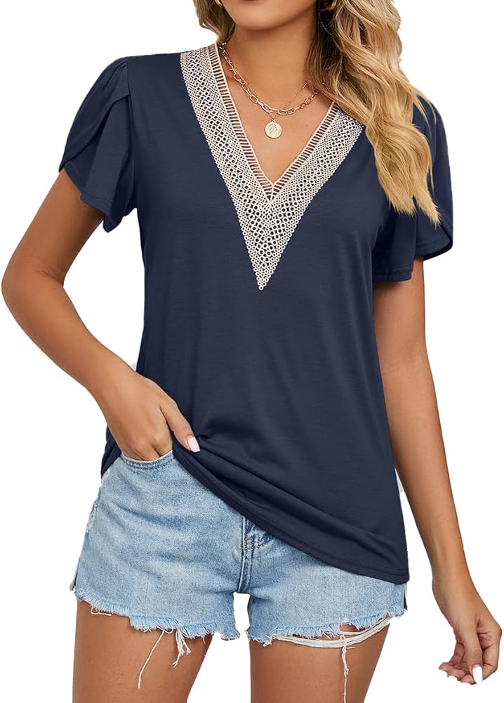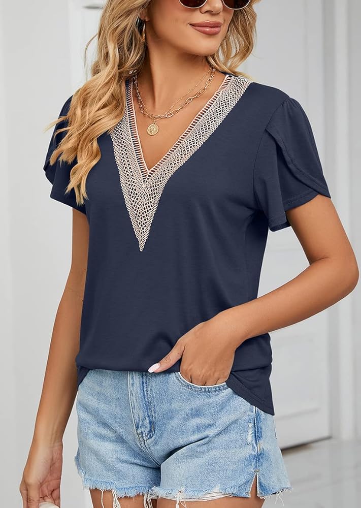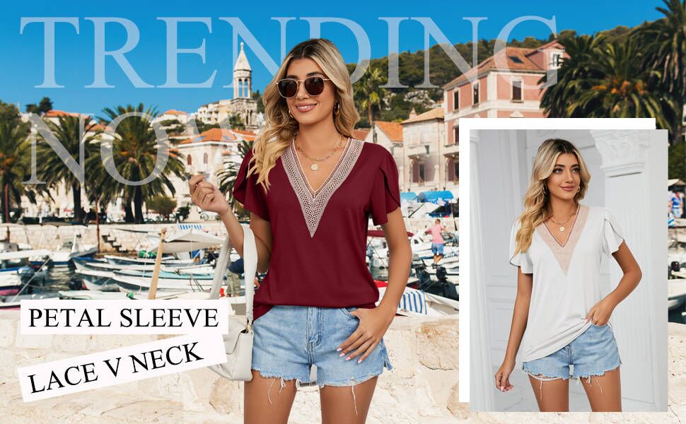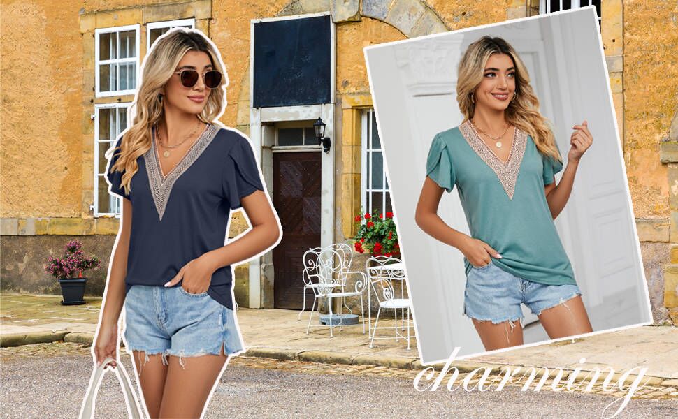 ميزات القمصان الكاجوال الأنيقة: أكمام مرفرفة / أكمام من التوليب، رقبة على شكل حرف V من الدانتيل، أكمام قصيرة، لون ثابت، سادة، لطيف جدًا وأنيق.