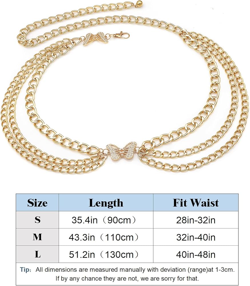 Boho Chain Belts Material: High quality metal. Three size to choose, which is suitable for most people. Length: 90cm/35.4in, Fit Waist: 28"-32". Length: 110cm/43.3in, Fit Waist: 32"-40". Length: 130cm/51.2in, Fit Waist: 40"-48"