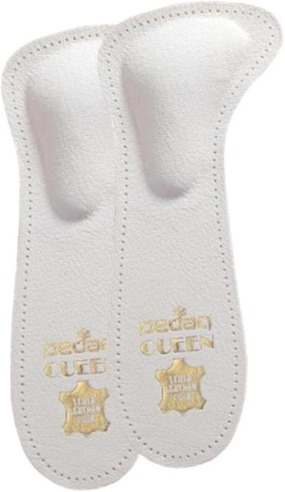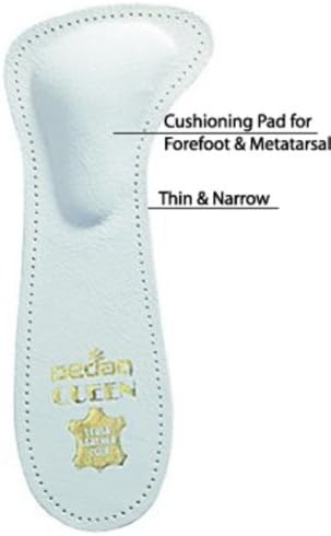 European sizes are unisex: For example: Even though EU 35/36 the packaging says US Men's size 2/3 the item is ALSO US Women's size 5/6. QUEEN: ¾-length insole relieves burning and pain in the forefoot with a built in, T-shaped, metatarsal pad. Burning and pain in the forefoot signals that issues such as splayfoot, metatarsalgia, and nerve damage may be developing or fully present. Queen lifts and keeps the metatarsal bones in the anatomically correct position; this relieves pressure on the entire forefoot. Queen is especially thin and slim: Perfect for even the dressiest high heels, pumps, open toed shoes, and sandals. Made of vegetable tanned leather, hypoallergenic latex, with a self-adhesive backing.