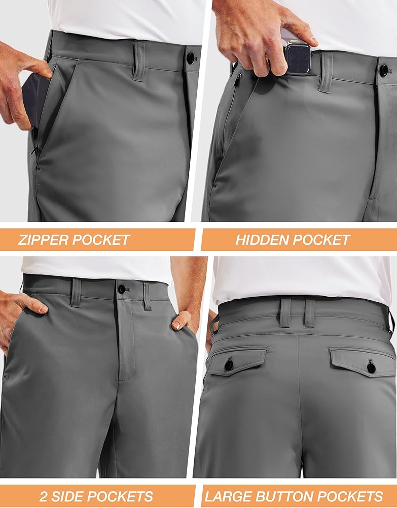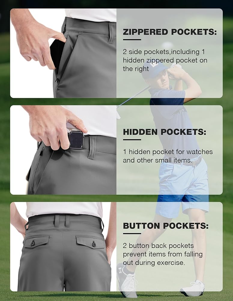 7 جيوب مريحة للاستخدام: تتميز شورتات الجولف عالية الأداء هذه بجيوب متعددة من أجل راحتك. تحتوي على جيبين جانبيين عميقين، وجيب واحد بسحاب، وجيب ساعة مخفي، وجيبين خلفيين بزرين لحمل المزيد من العناصر.