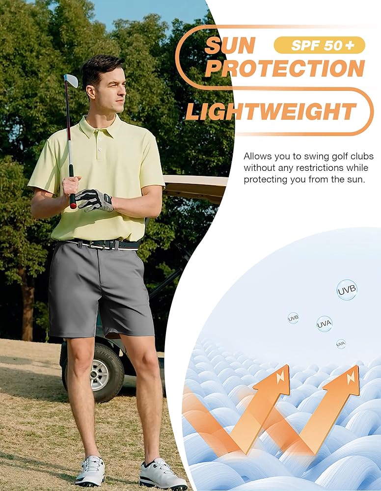 نسيج خفيف الوزن وسريع الجفاف: شورت الجولف الرجالي هذا مصنوع من نسيج عالي الأداء مريح للغاية، خفيف الوزن، سريع الجفاف، وجيد التهوية. مع عامل حماية من الأشعة فوق البنفسجية 50+ وخصائص ماصة للرطوبة، فإنها تضمن جفافًا ومريحًا طوال اليوم.