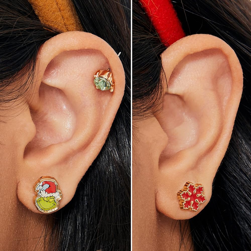 تتميز مجموعة الأقراط المرصعة بحجر الراين الأخضر وندفة الثلج الحمراء أيضًا بأقراط ذا جرينش للارتداء المرح.
