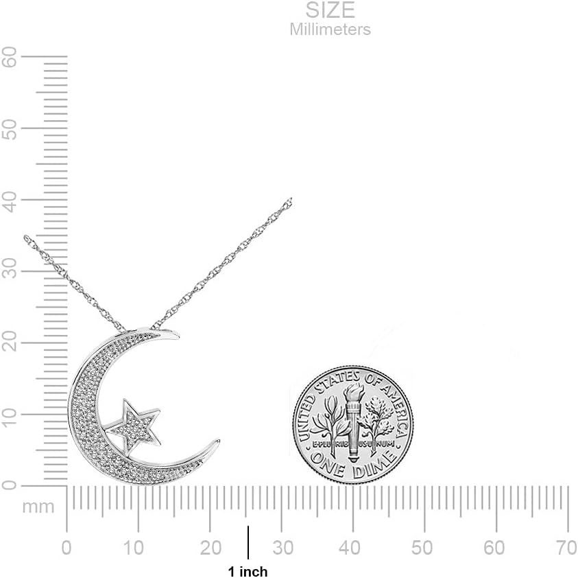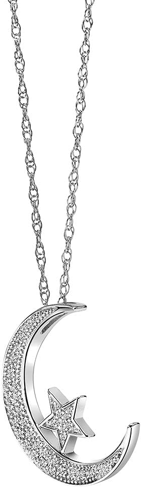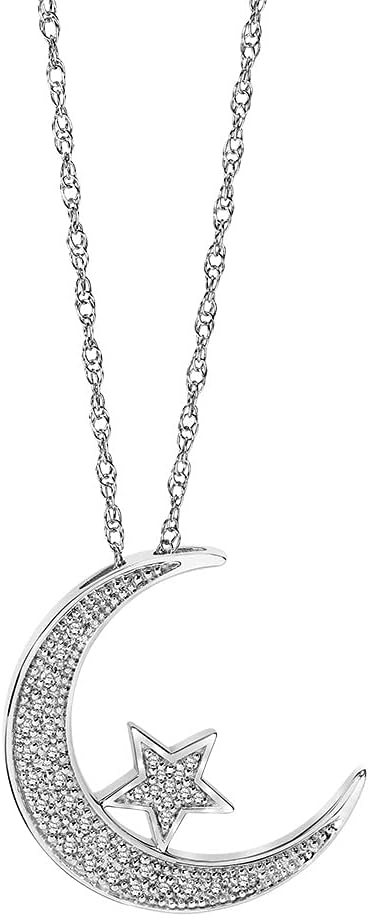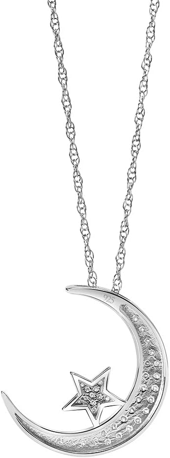 This beautiful diamond crescent moon and star pendant necklace is custom designed to be the perfect gift for yourself or for the star of your life! Crescent moon represents clarity, empowerment, and permanence. As a lucky sign to be wished upon, star helps navigate and leads you to your desired destination. This necklace is meticulously crafted with genuine solid 925 Sterling Silver and stamped with a 925-quality hallmark for both pendant and the 18-inch adjustable spring-ring closure rope chain. It can be worn every day, on its own or layer with multiple necklaces to complete your look.