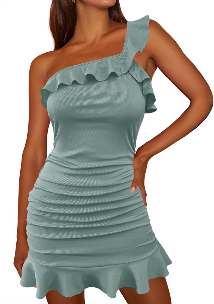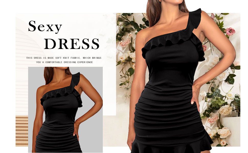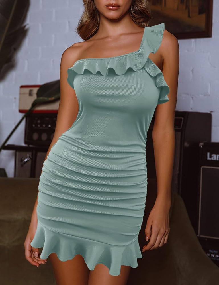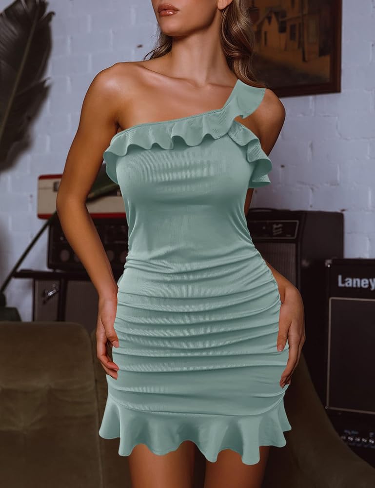 المزايا: فستان نسائي قصير صيفي كاجوال، كتف واحد، زخرفة مكشكشة، فستان قصير مكشكش، لون ثابت، فستان قصير للحفلات، فستان شمس للشاطئ، فستان قصير مثير