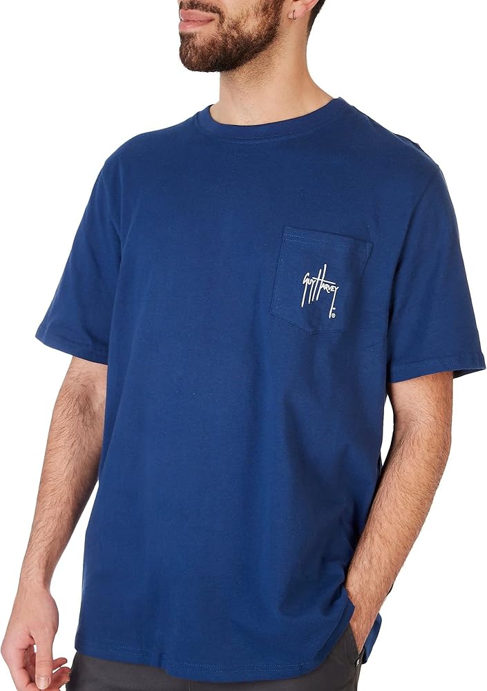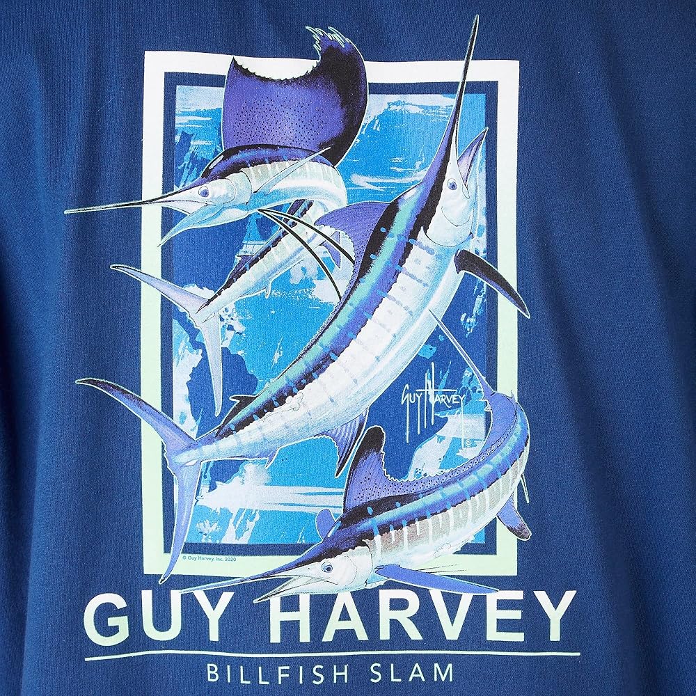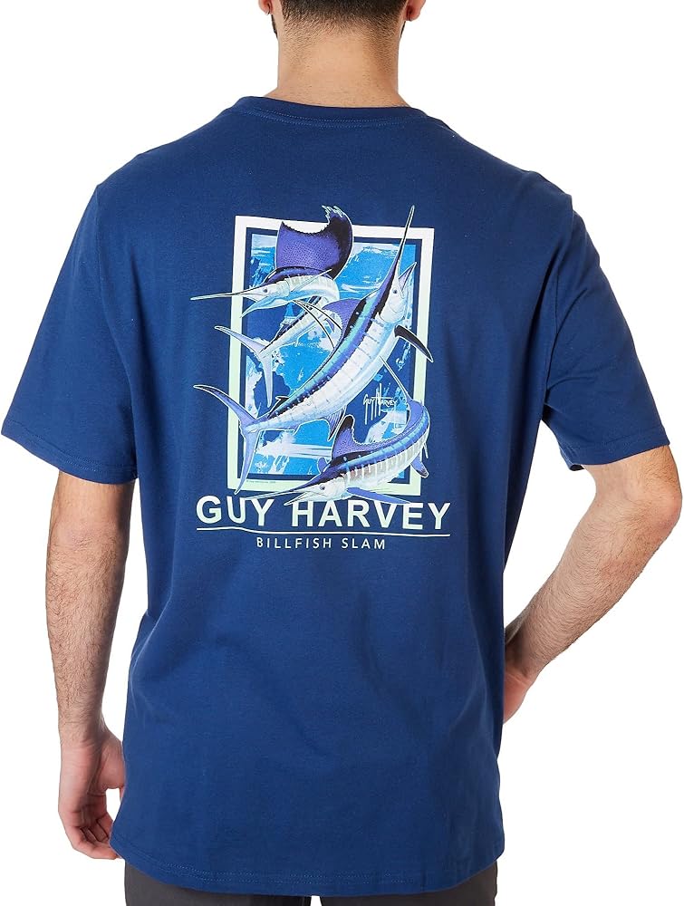 Guy Harvey features his award-winning marine artwork on this stylish coastal short sleeve tee. It features lightweight breathable cotton knit fabric, an original brand Guy Harvey with bill fish slam graphic design on the back, a Guy Harvey logo on the chest pocket, and a flexible crew neckline. 100% Cotton.