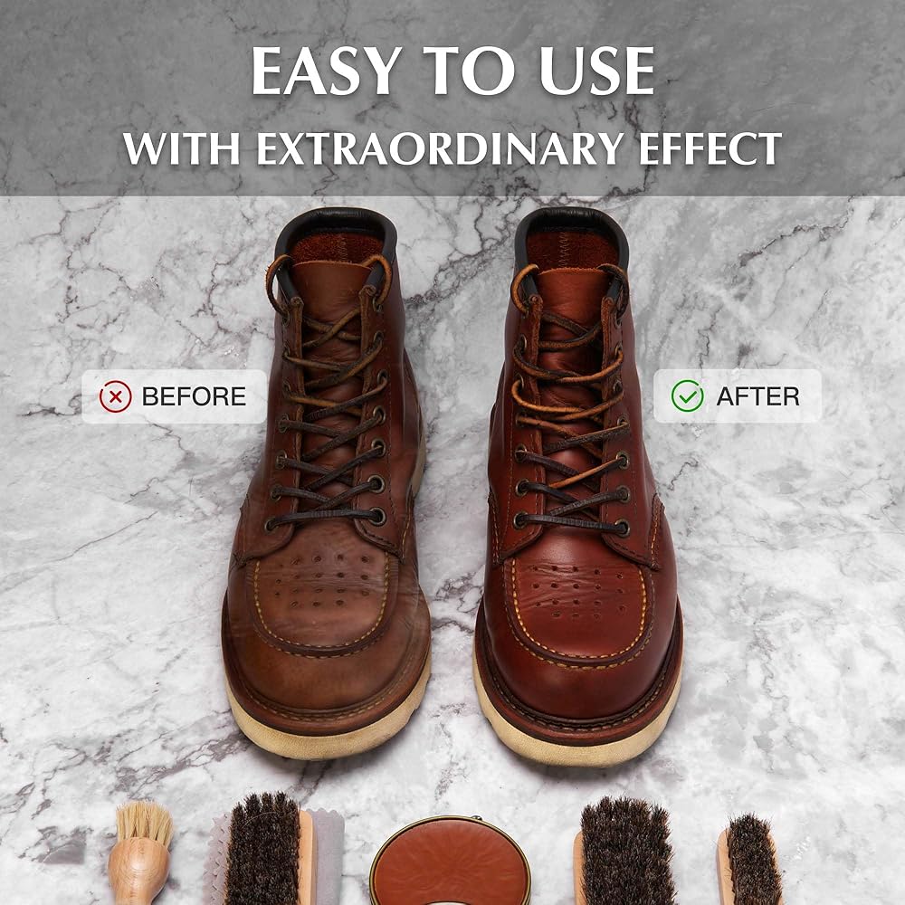 تطبيق واسع للغاية: أكثر من مجرد مجموعة تنظيف الأحذية. السترات الجلدية والسروج والأحذية والمحفظة وحقائب اليد والمحافظ والإكسسوارات والأثاث ومقاعد السيارة، يمكنها تنظيف جميع السلع الجلدية في منزلك. شعر الحصان الطبيعي، رقيق وناعم، لن يؤذي سطح جلدك أبدًا. اجعل التنظيف متعة.