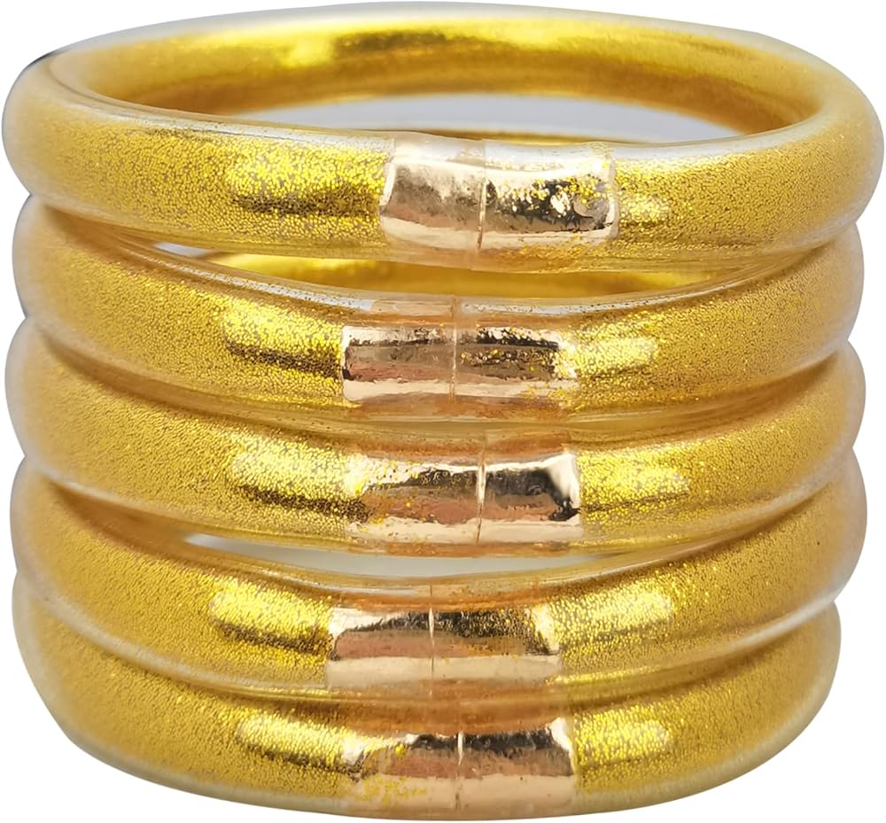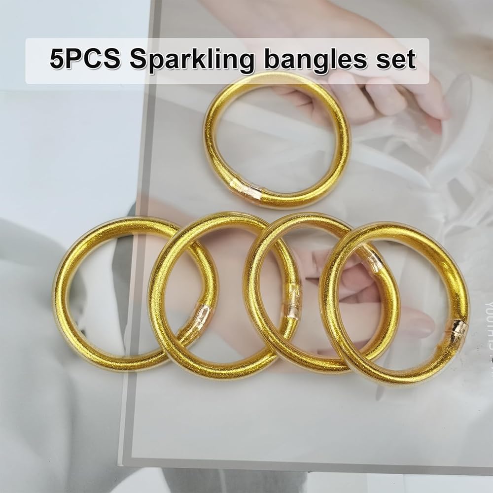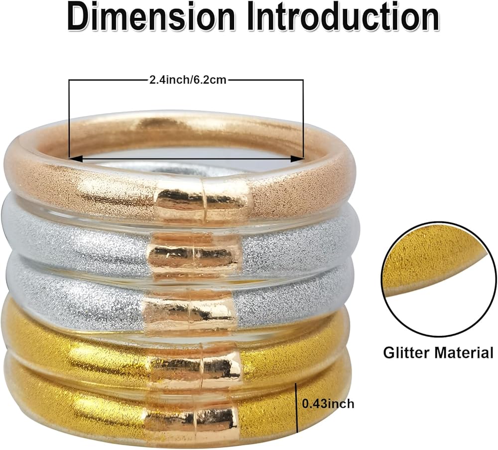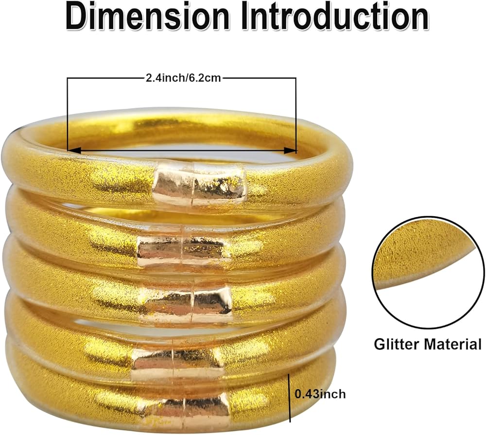 ♥مواد فاخرة: سوار جيلي لامع مصنوع من مسحوق الذهب والمعادن والسيليكون. إجمالي 5 قطع من أساور الجلي اللامعة، ديكور مثالي للسفر والحفلات والتسوق والعمل. يختلف عن المواد المعدنية الأخرى. نحن نستخدم قطعة معدنية مطلية بالذهب الحقيقي بدلاً من المعادن العامة.