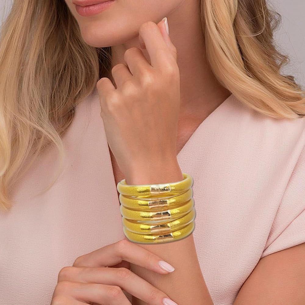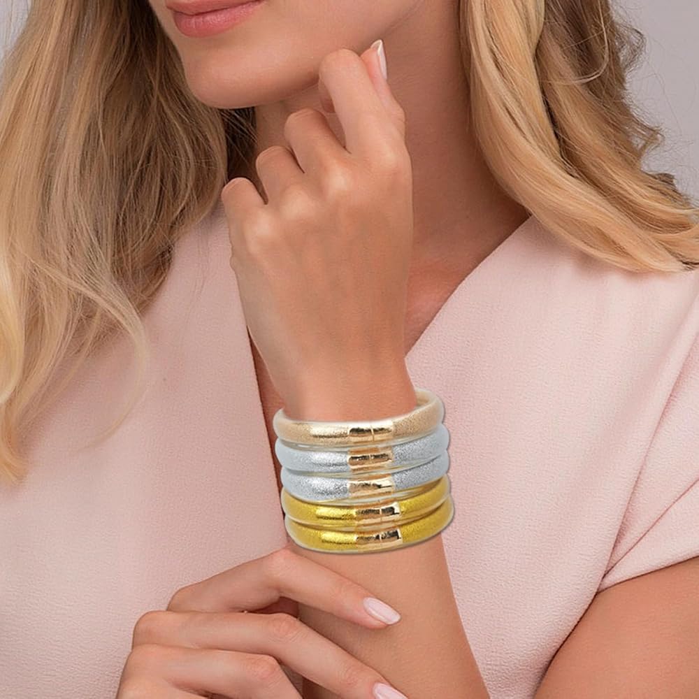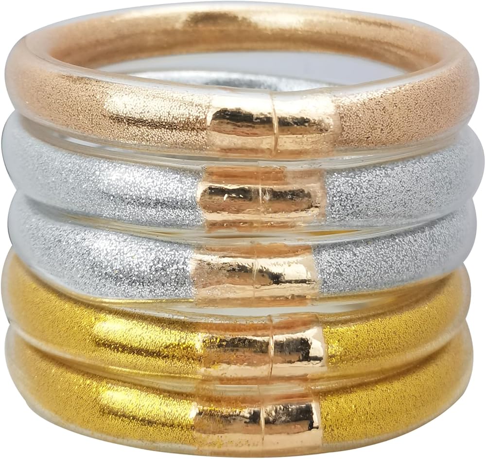 ♥مواد فاخرة: سوار جيلي لامع مصنوع من مسحوق الذهب والمعادن والسيليكون. إجمالي 5 قطع من أساور الجلي اللامعة، ديكور مثالي للسفر والحفلات والتسوق والعمل. يختلف عن المواد المعدنية الأخرى. نحن نستخدم قطعة معدنية مطلية بالذهب الحقيقي بدلاً من المعادن العامة.
