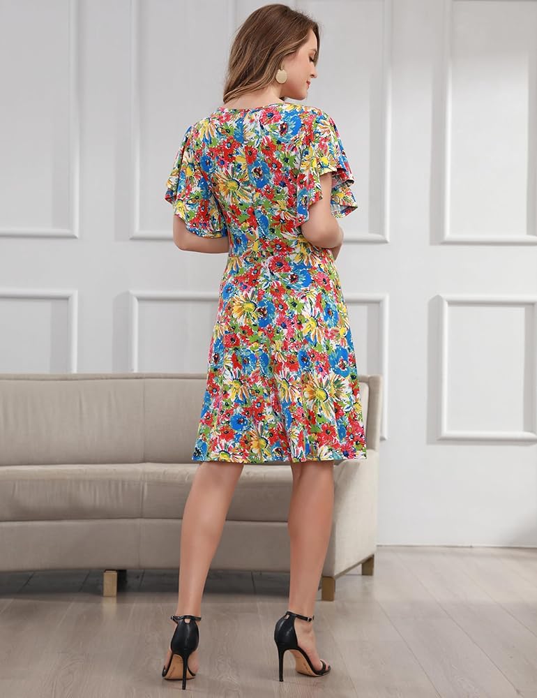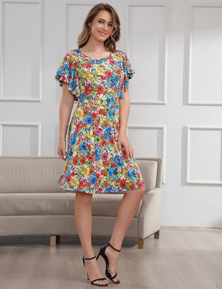 القماش: نسيج ناعم بطبعات زهور، فستان جيرسي قابل للتمدد، فستان بأكمام مرفرفة يمكنك قضاء يوم مريح ومريح في الربيع والصيف والخريف.