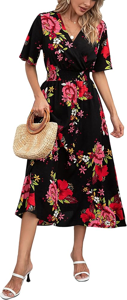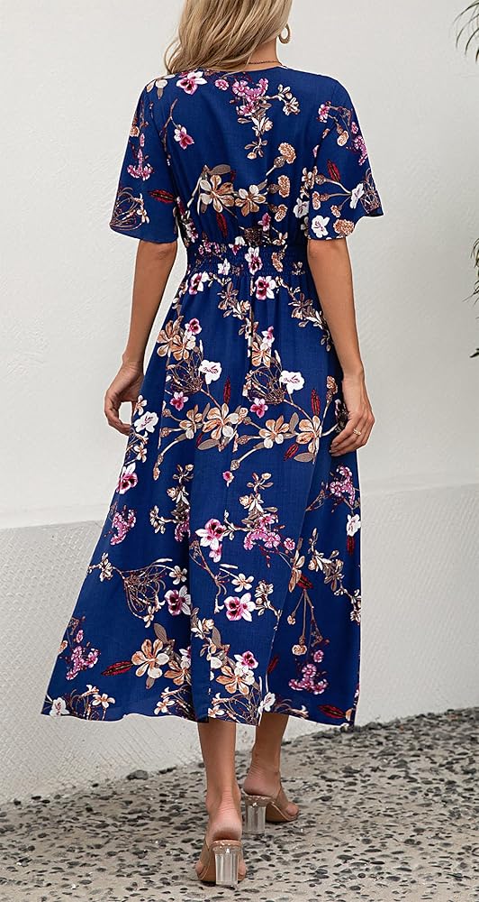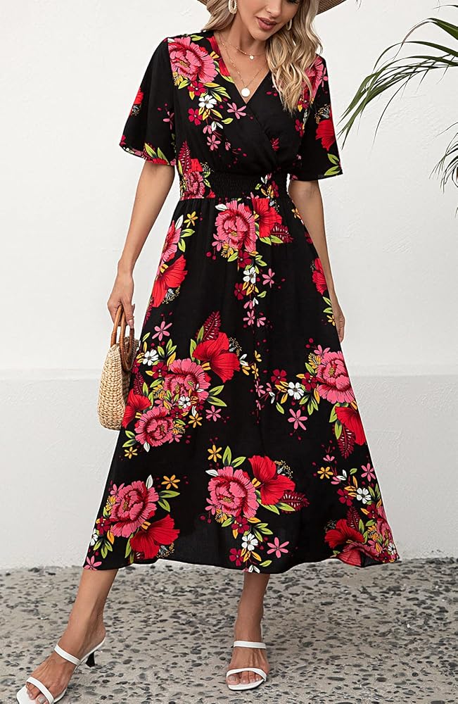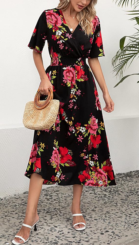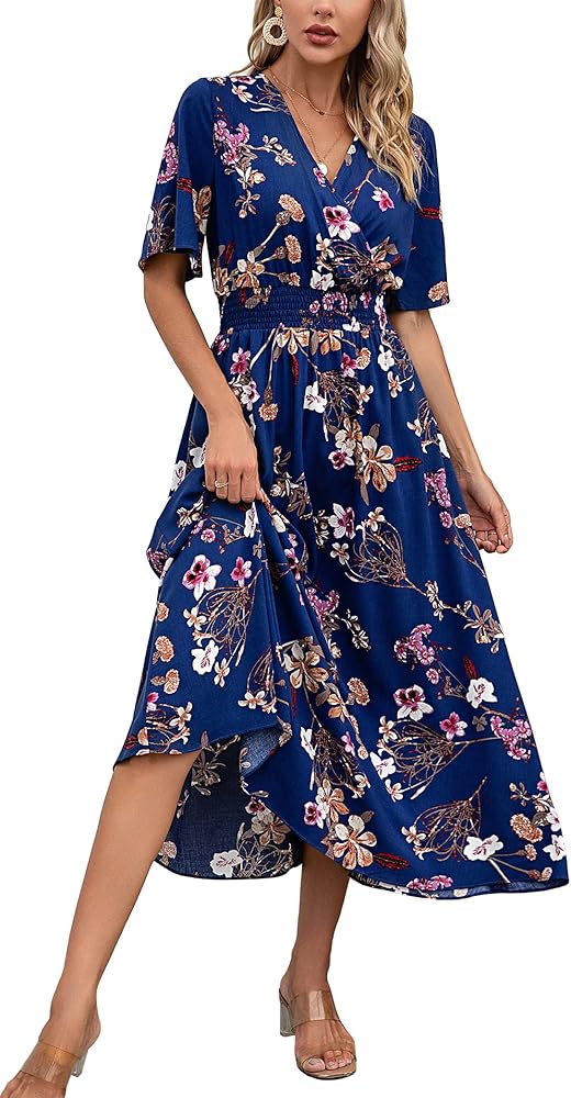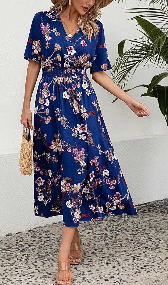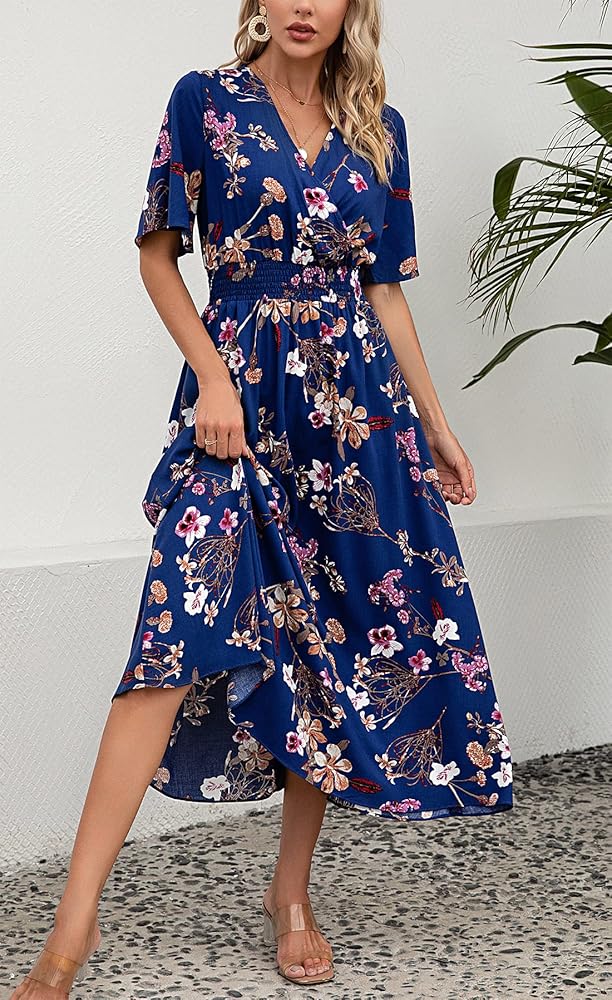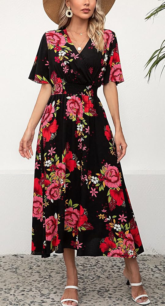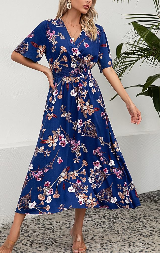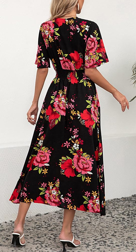 نمط الموضة: كم قصير/طباعة زهور/فستان بوهو بخصر مكشكش/فستان طويل مطبوع للنساء/فساتين بوهو بأكمام قصيرة/فستان على شكل حرف A/فستان متأرجح عالي الخصر/فستان صيفي للنساء/فستان مناسب ومتوهج للنساء/فستان طويل خفيف الوزن /فستان طويل للشاطئ للنساء
