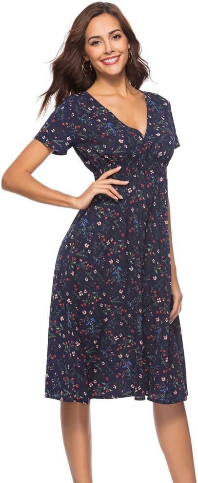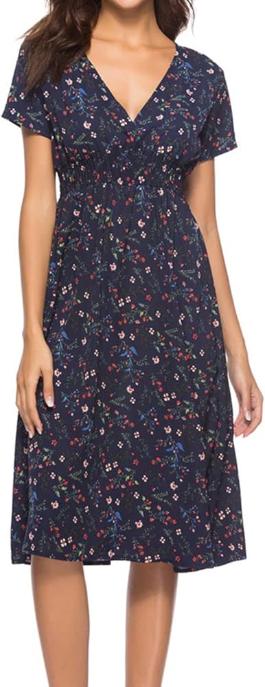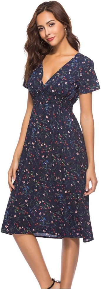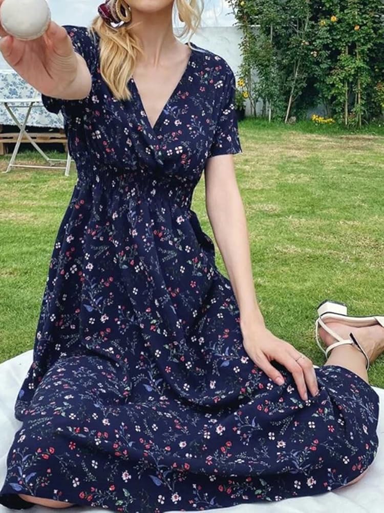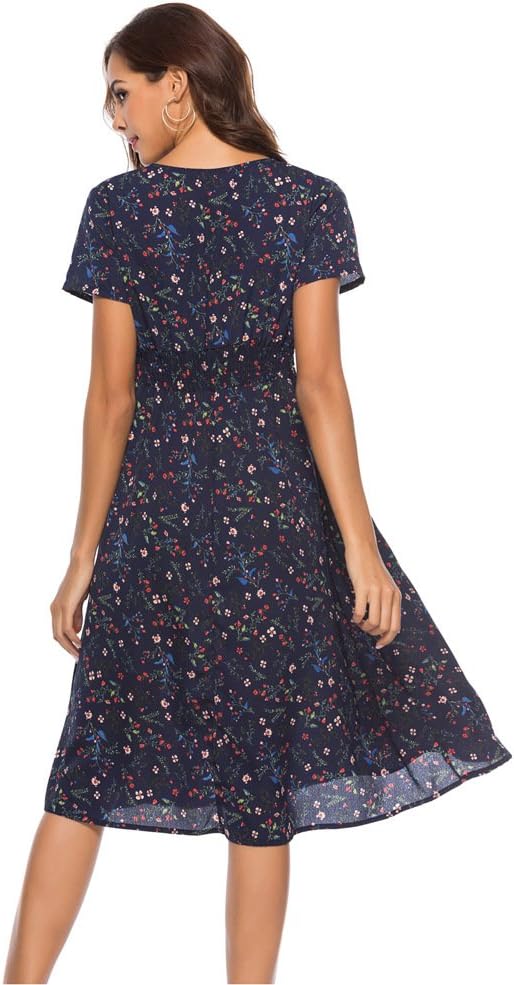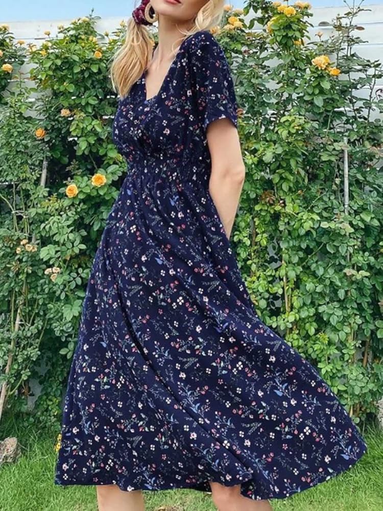 فستان بوهو فستان شيفون مطبوع عليه زهور ورقبة على شكل V وأكمام قصيرة وخصر مرن فستان شاطئ متوسط ​​الطول للنساء والفتيات