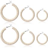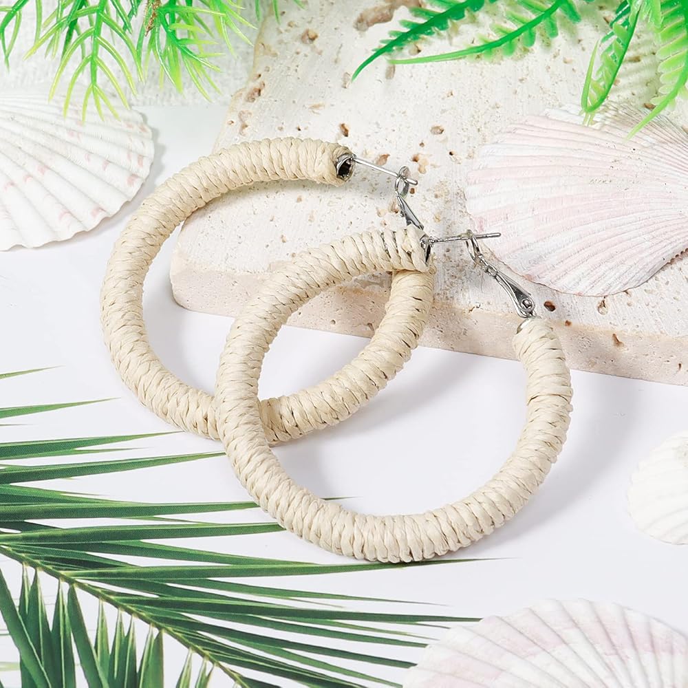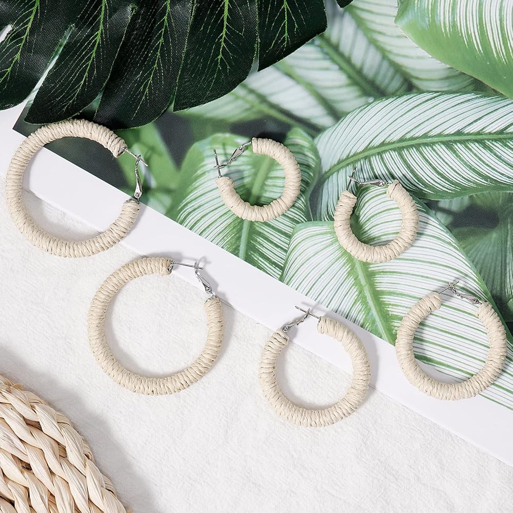 أقراط راتان للنساء مصنوعة يدويًا من بوهو الرافية المنسوجة أقراط حلقية متعددة الأقراط من القش للعطلات الصيفية للنساء