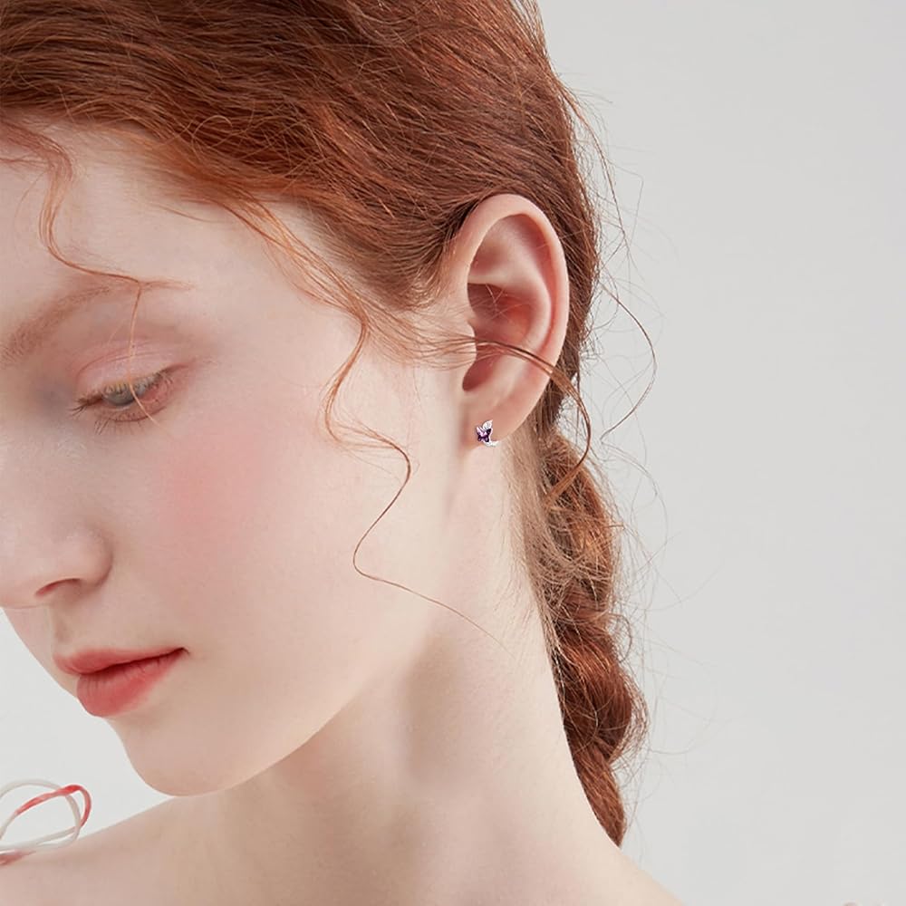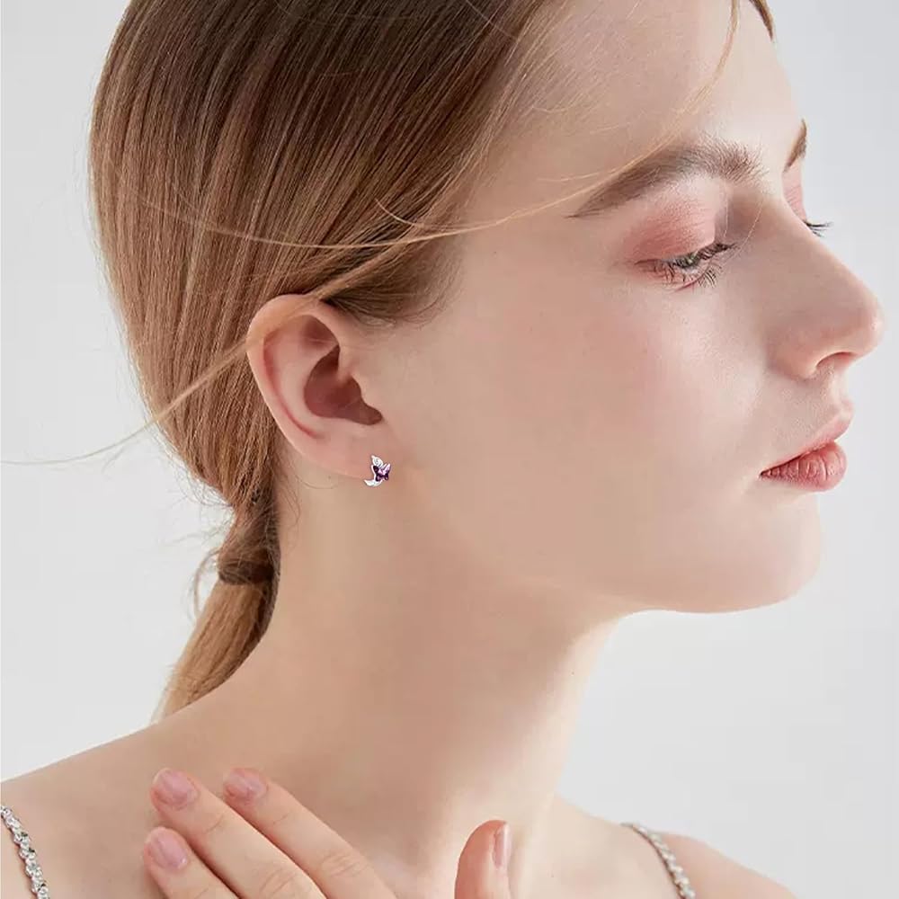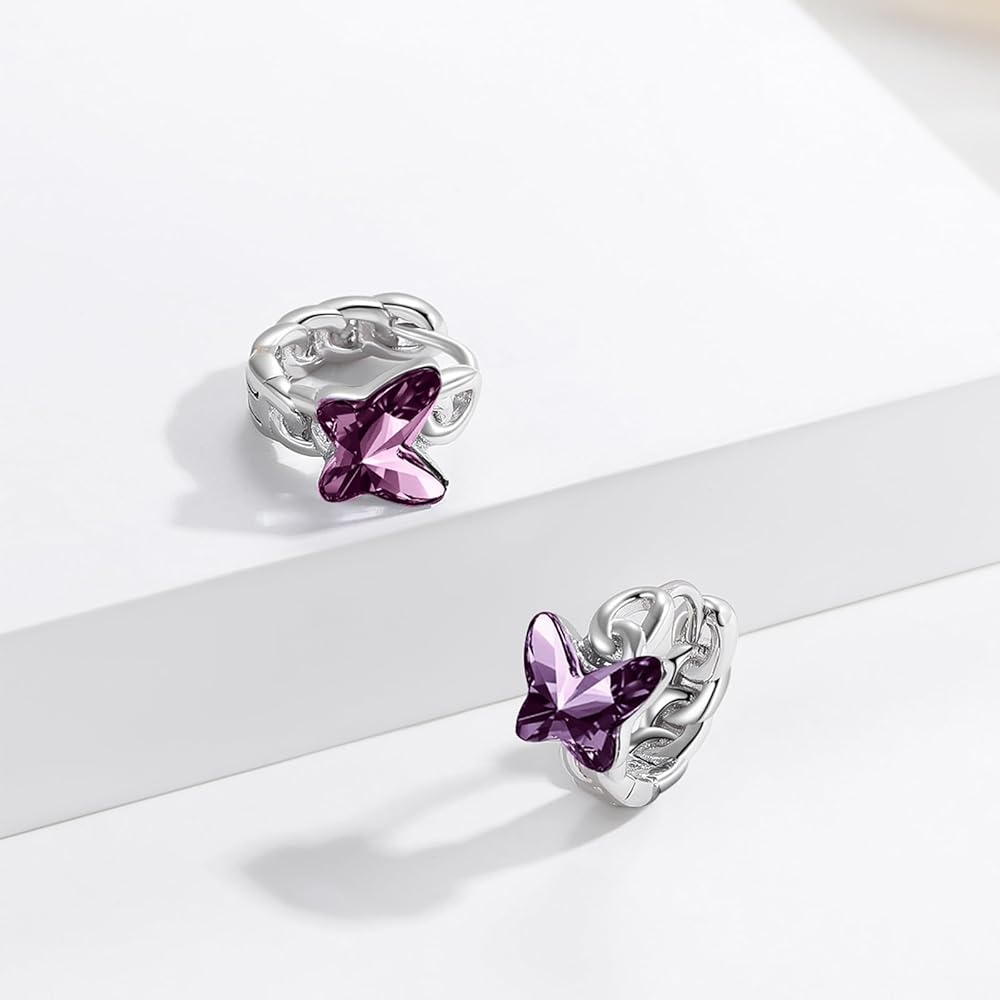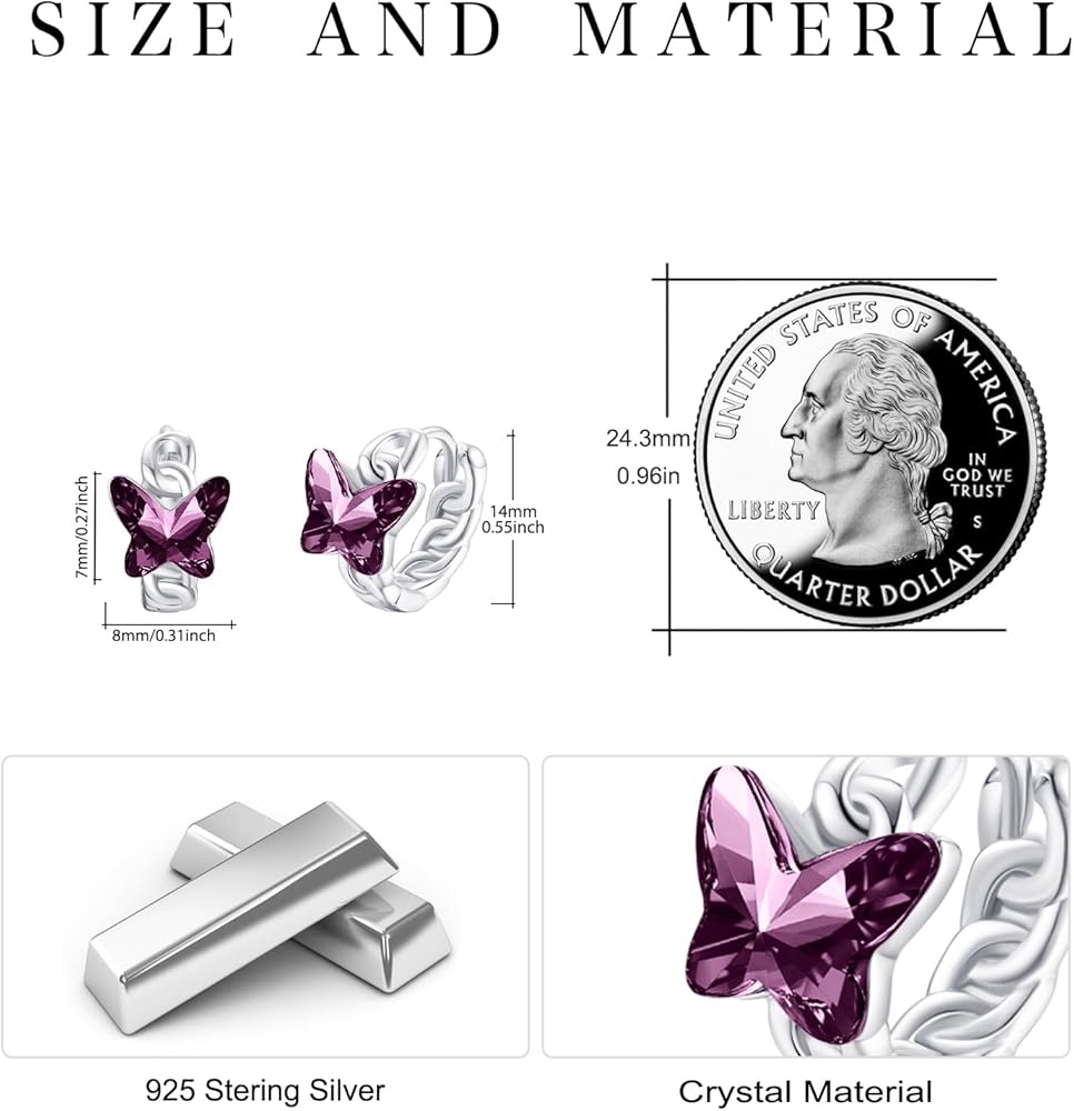 Sterling Silver Earrings: These butterfly earrings are made of 925 sterling silver, which gives it strength and durability while still maintaining its beautiful shine. In addition to the sterling silver, these earrings also feature purple crystals, which add a pop of color and sparkle to the design.