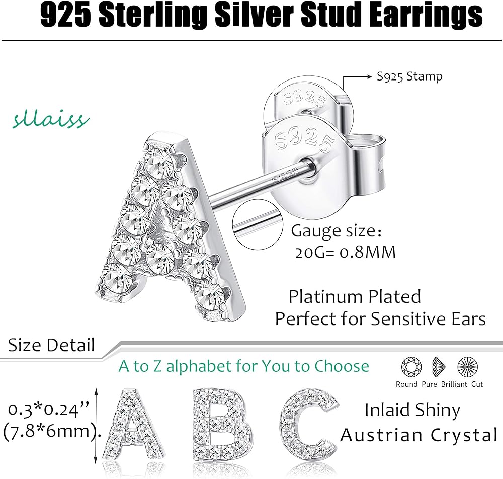 ✿ المواد: الأقراط المرصعة بالكريستال النمساوي مصنوعة من الفضة الإسترلينية عيار 925 عالية الجودة. سطح مطلي بالبلاتين ومصقول بدرجة عالية، تتميز الأقراط المرصعة بالحروف بمزايا خالية من النيكل، ولا تسبب الحساسية، ومتينة ولامعة، وصديقة للبيئة. بما أن القرط المرصع يأتي مع صندوق مجوهرات أنيق، لذلك يمكنك تقديمه كهدية مثالية لحبيبتك أو صديقتك أو أختك أو ابنتك أو أمك في أي مناسبة مثل عيد الميلاد أو عيد الميلاد أو عيد الأم أو الذكرى السنوية وما إلى ذلك.