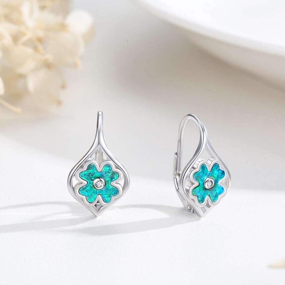ECHOOY St.Patrick's Day Earrings Four Leaf Clover Earrings Sterling Silver Green Opal Lucky Four Leaf Leverback Earrings Green Irish Jewelry Gifts for Women Girls Teens